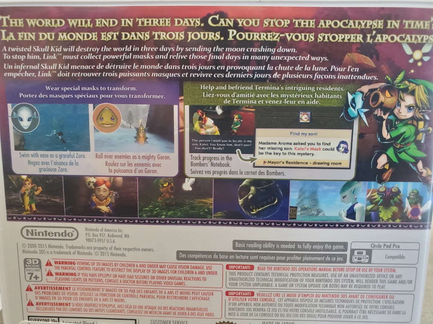 This is The Legend of Zelda: Majora's Mask 3D game for Nintendo 3DS. It's rated E10+ by the ESRB. The game includes the cartridge and original box.