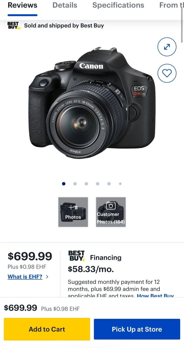 Canon EOS Rebel T7 DSLR camera with an 18-55mm lens. It comes with a charger and lens cap. This camera is great for capturing high-quality photos and videos. Purchased from Best Buy few month ago. Used only once or twice.