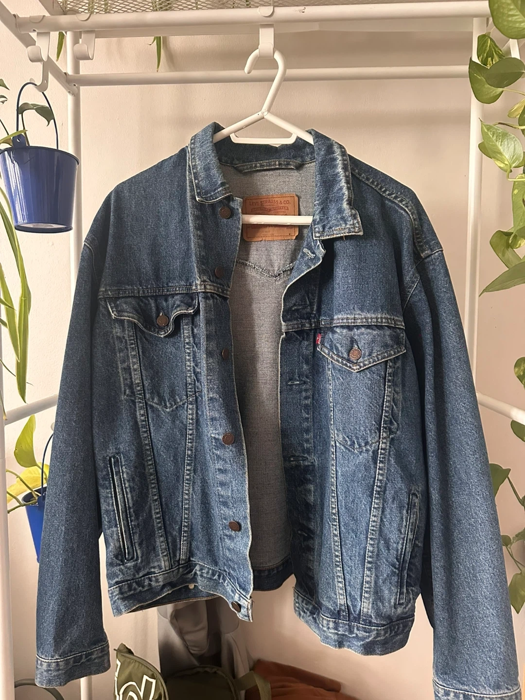 Classic blue denim trucker jacket from Levi Strauss & Co. It's a size medium baggy and made from durable denim material. This jacket is a great layering piece for any outfit!