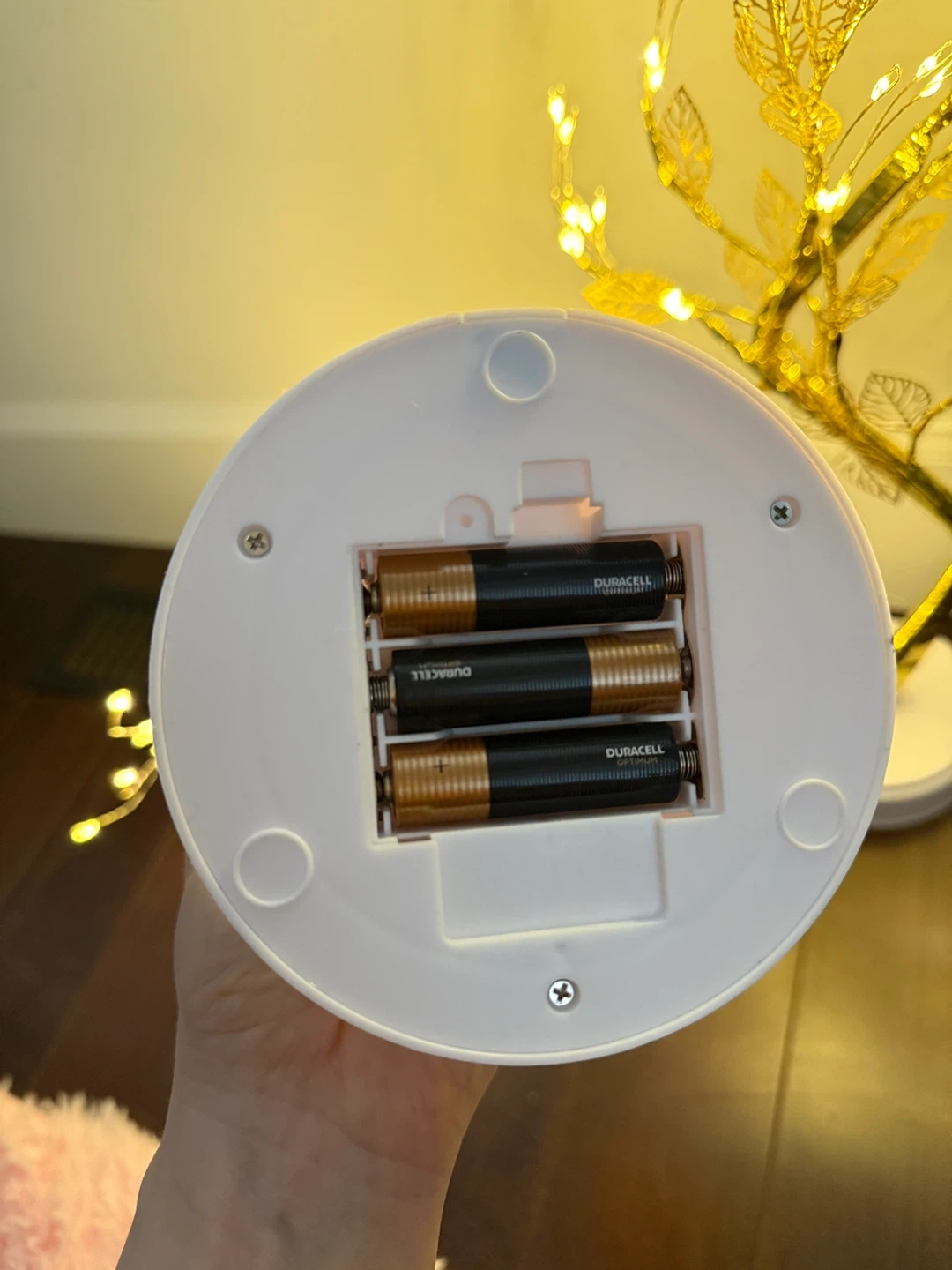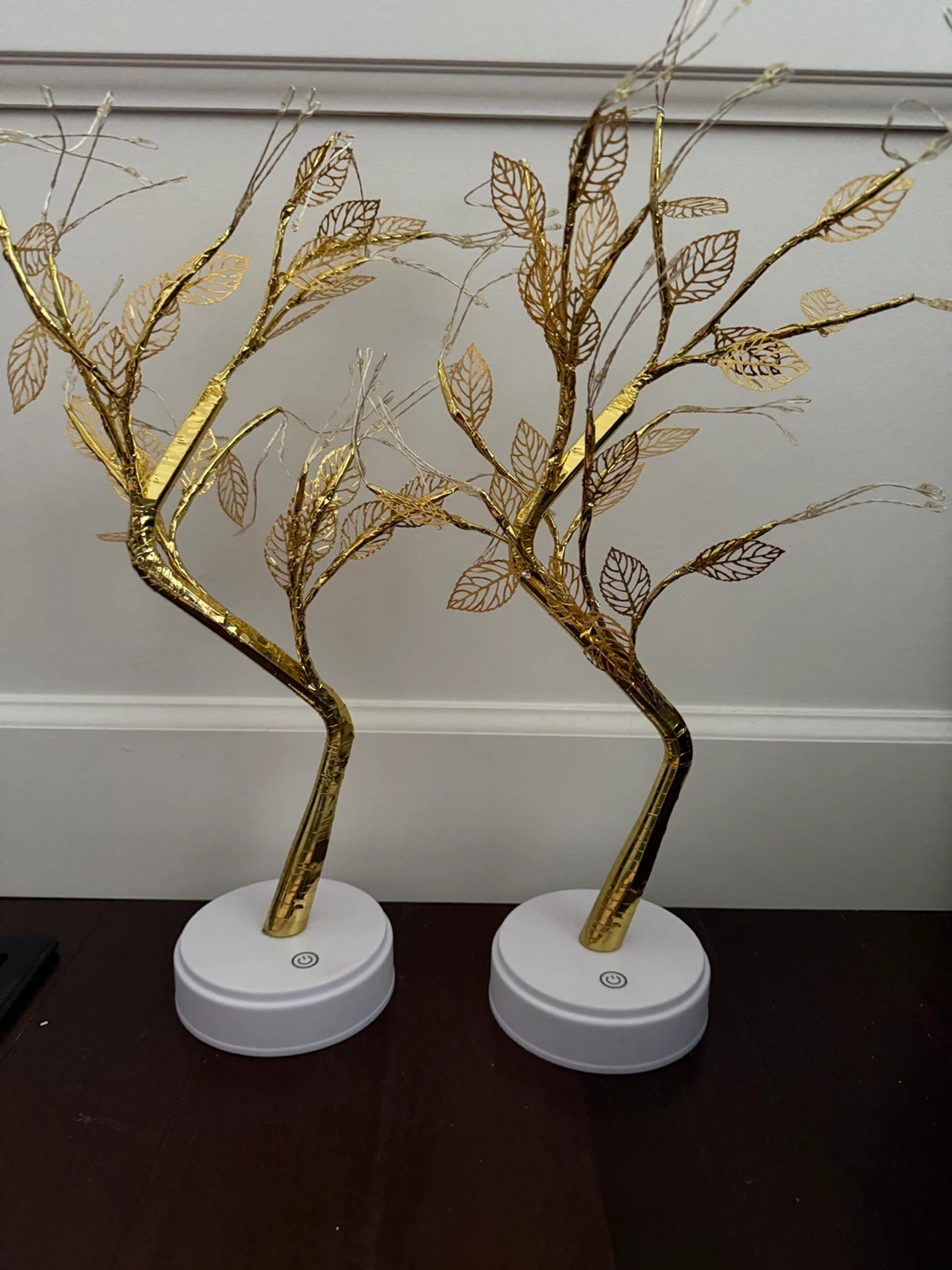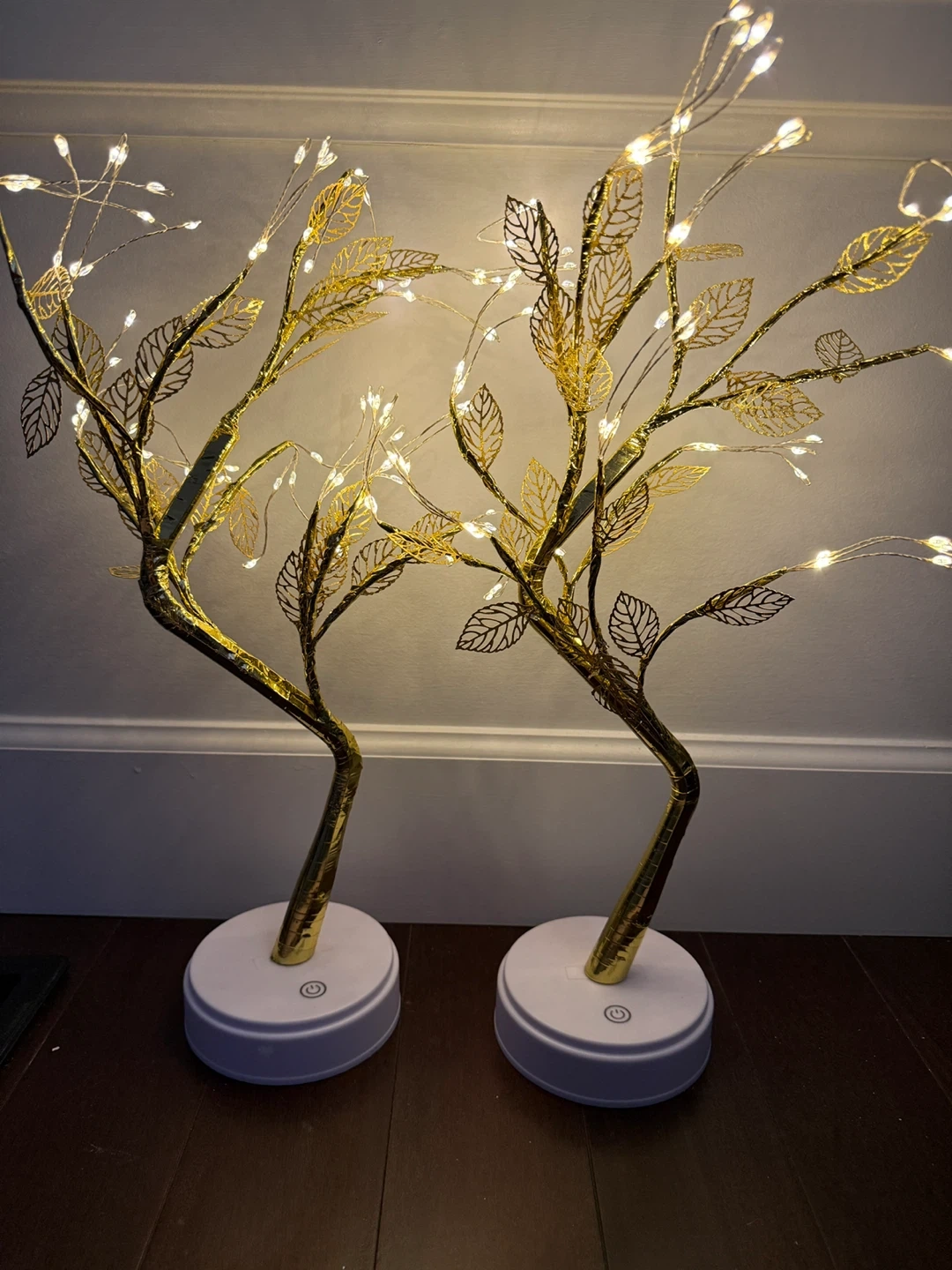 Set of two decorative trees with LED lights. Each tree has a gold finish with delicate leaf accents. The tree branches are bendable as well, and they also have a flickering feature! They run on 3 AA batteries each, which are not included. These lights create a warm ambiance!