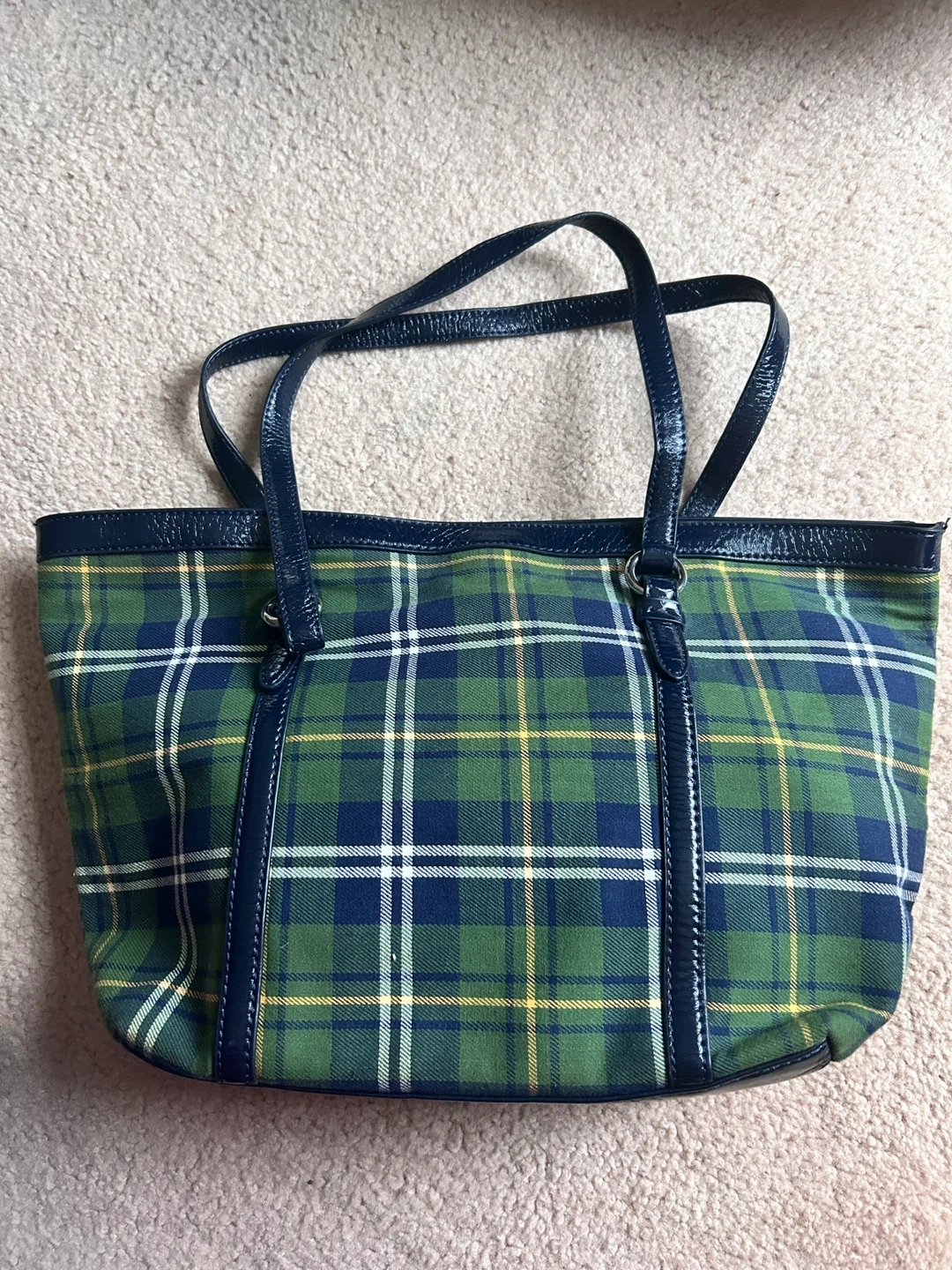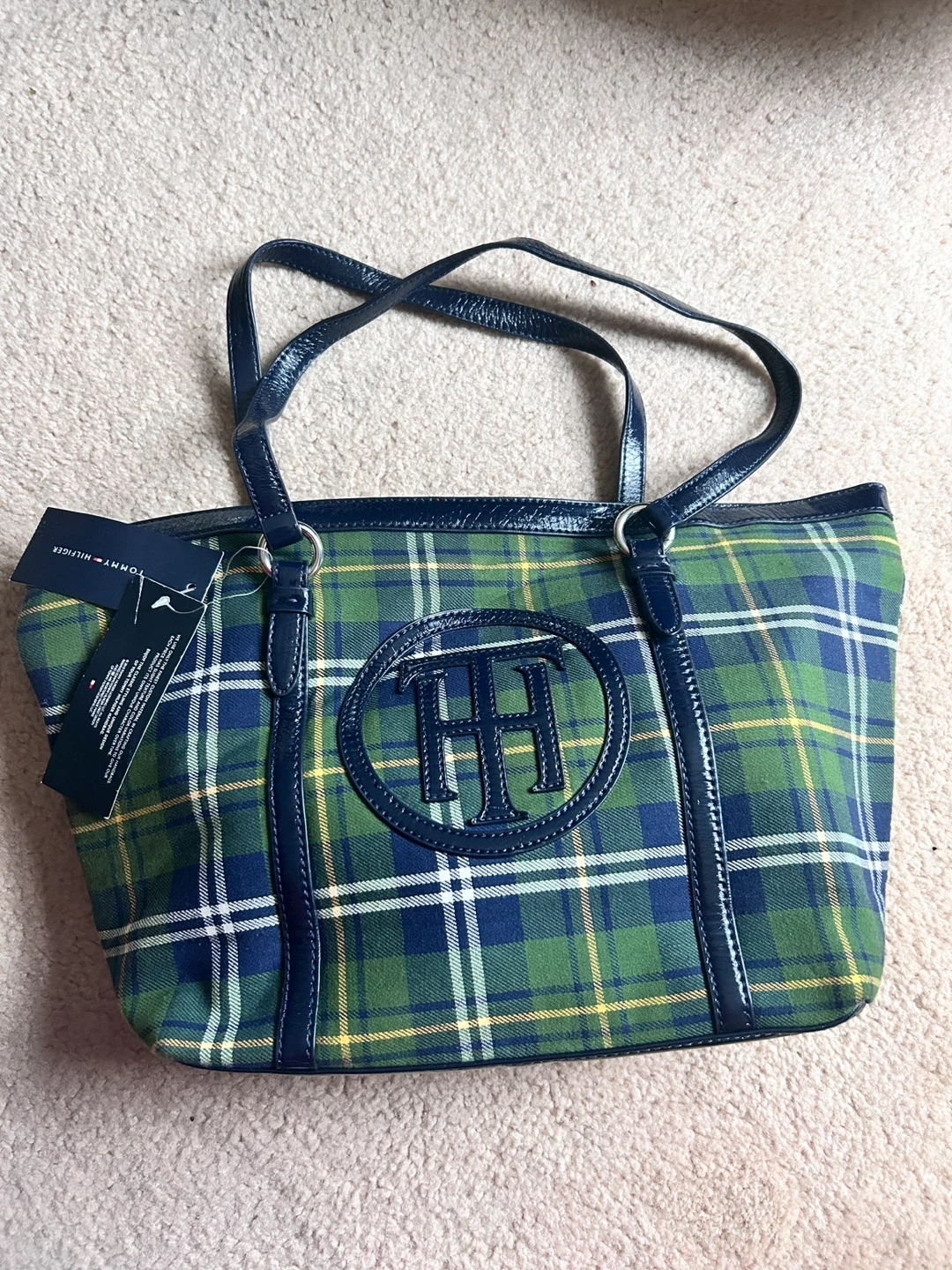 Tommy Hilfiger tote bag in a green, blue, and yellow plaid pattern. It has navy patent trim and handles. Interior features include a zippered pocket.