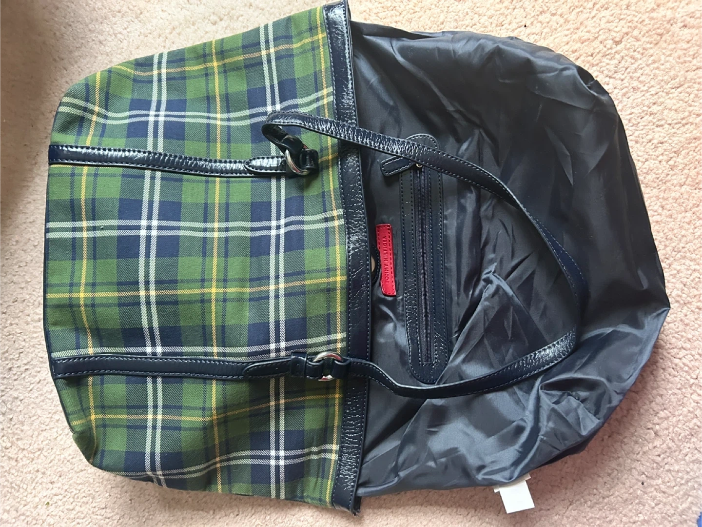 Tommy Hilfiger tote bag in a green, blue, and yellow plaid pattern. It has navy patent trim and handles. Interior features include a zippered pocket.