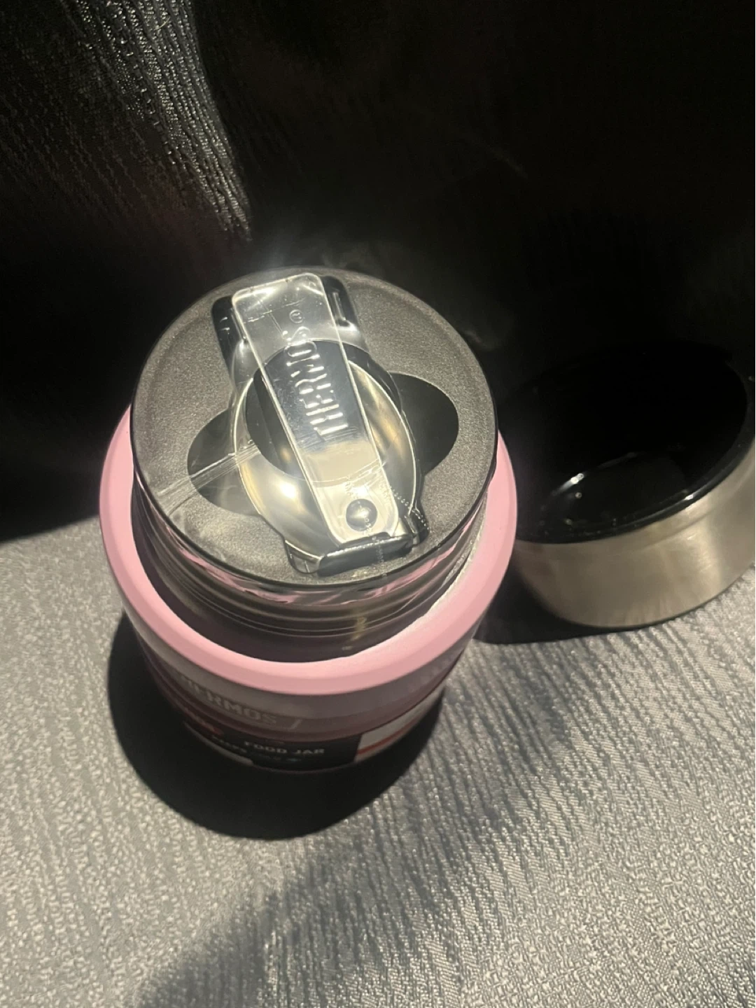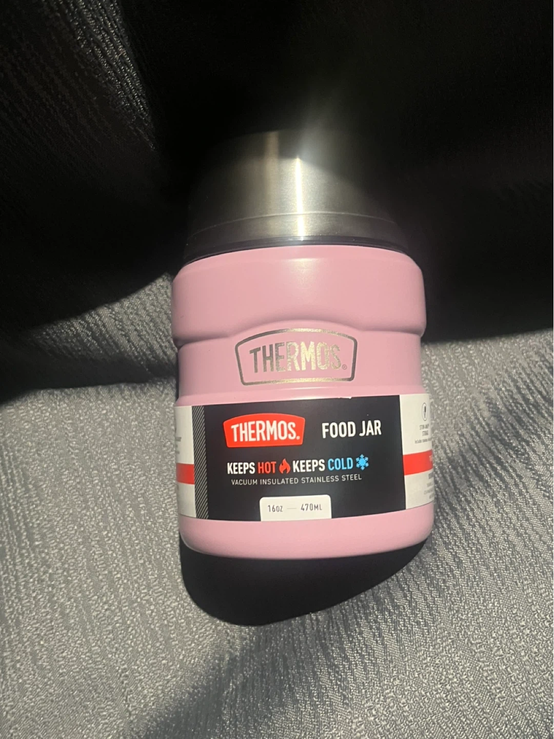This Thermos food jar is vacuum insulated and made of stainless steel. It's designed to keep food hot or cold for hours. Comes with a built-in spoon.
