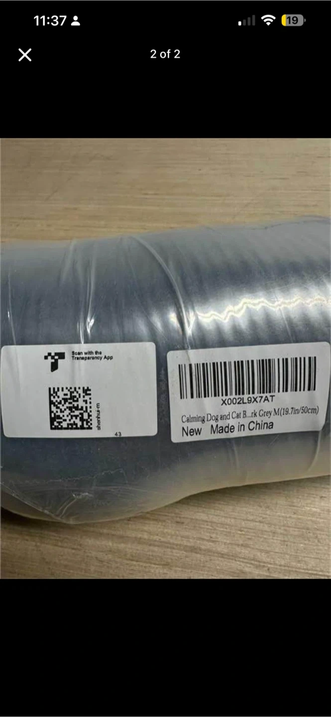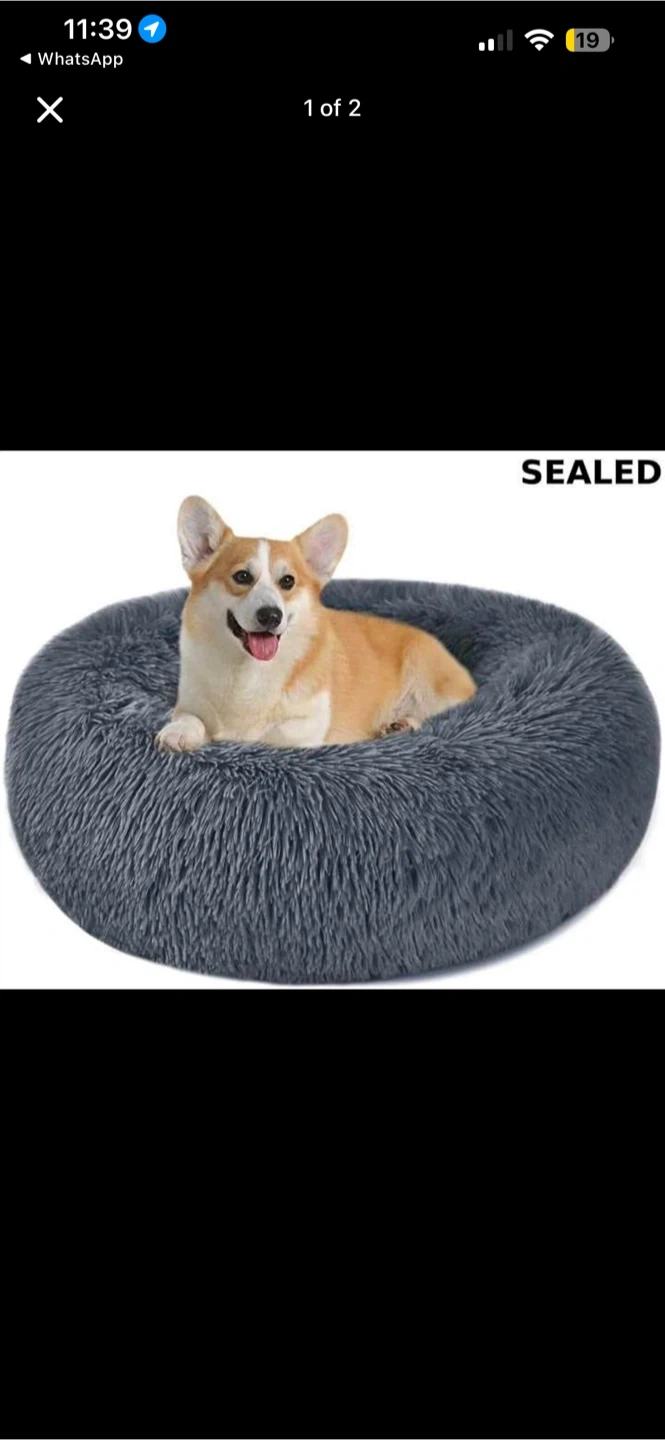 This is a calming dog and cat bed in dark grey, size medium. It measures 19.7 inches (50 cm) in diameter. The bed is made with soft, plush material.