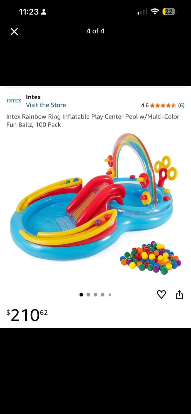 This Intex Rainbow Ring Inflatable Play Center Pool comes with a 100 pack of multi-color fun ballz. It features a rainbow arch and two slides for extra play. It's made of durable vinyl material and includes an accessory וב. This inflatable pool is great for summer fun for kids!