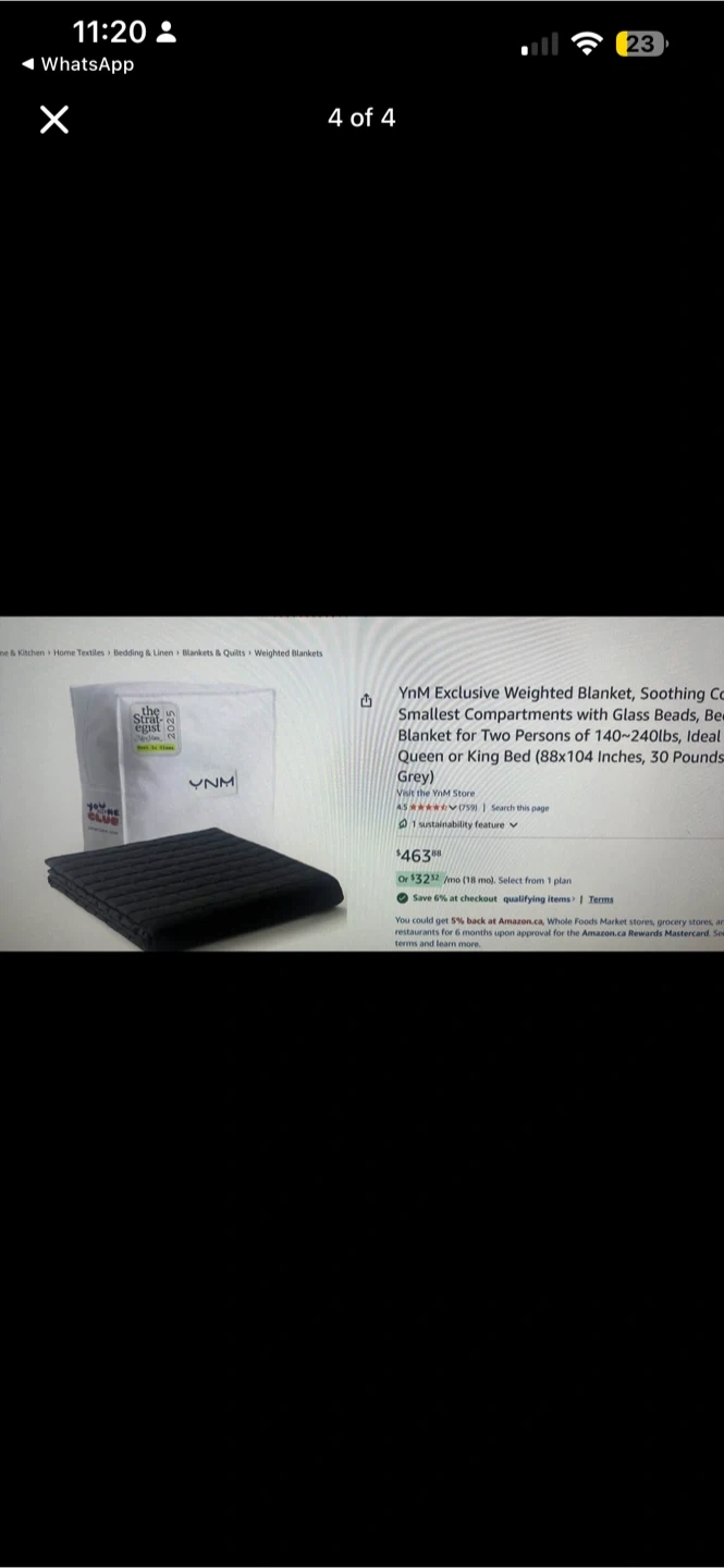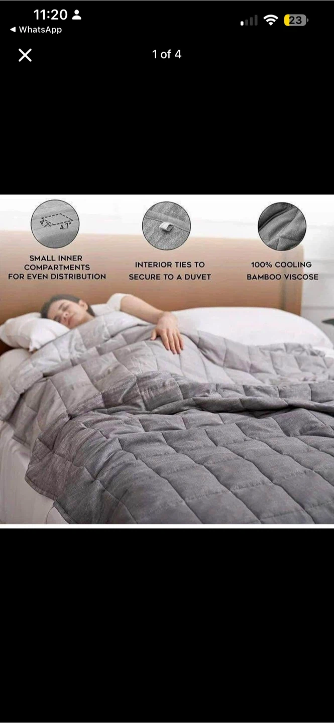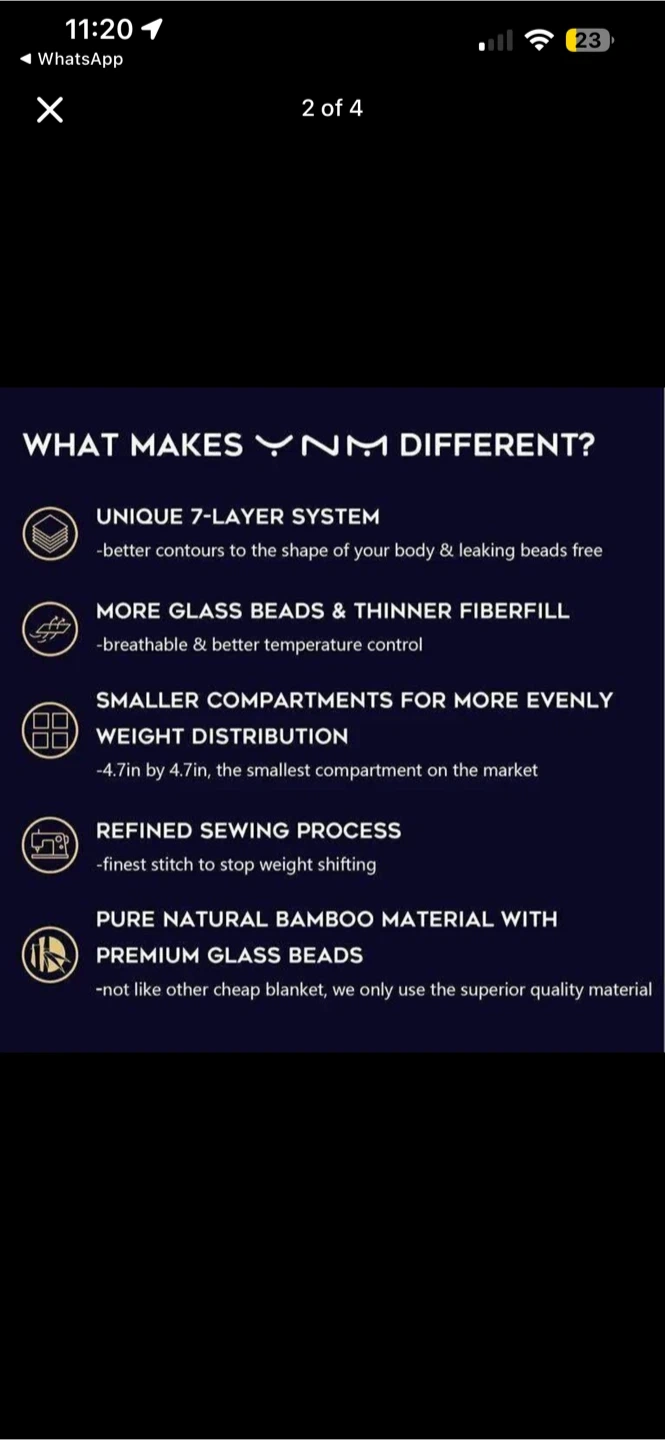 This YNM Exclusive weighted blanket is designed for two people, suitable for a Queen or King bed. It features a unique 7-layer system with smaller compartments for better weight distribution and uses premium natural bamboo material with glass beads. Interior ties are included to secure it to a duvet.