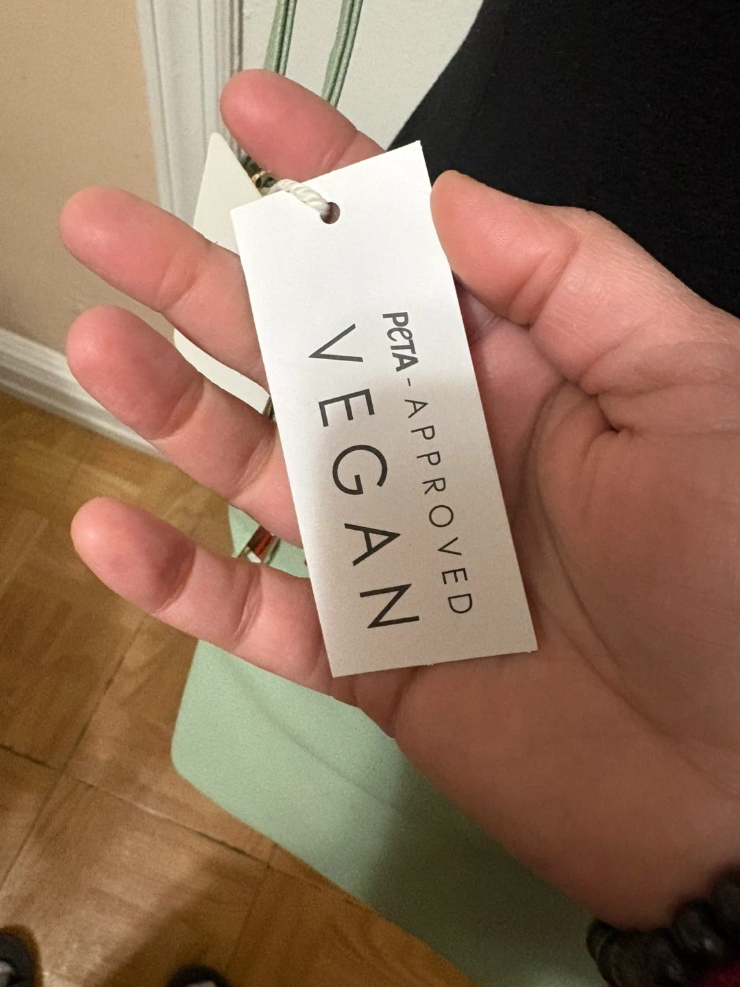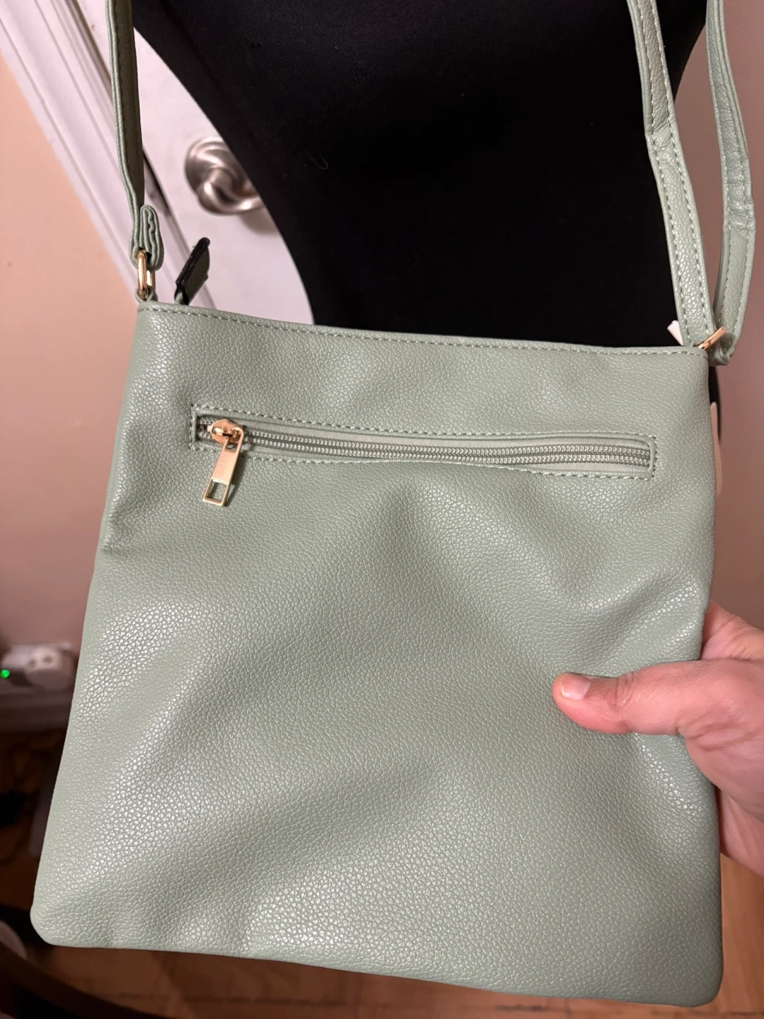 This is a mint green crossbody bag from Risotto. It's PETA-approved vegan material and features multiple zippered compartments. The interior has a striped lining.