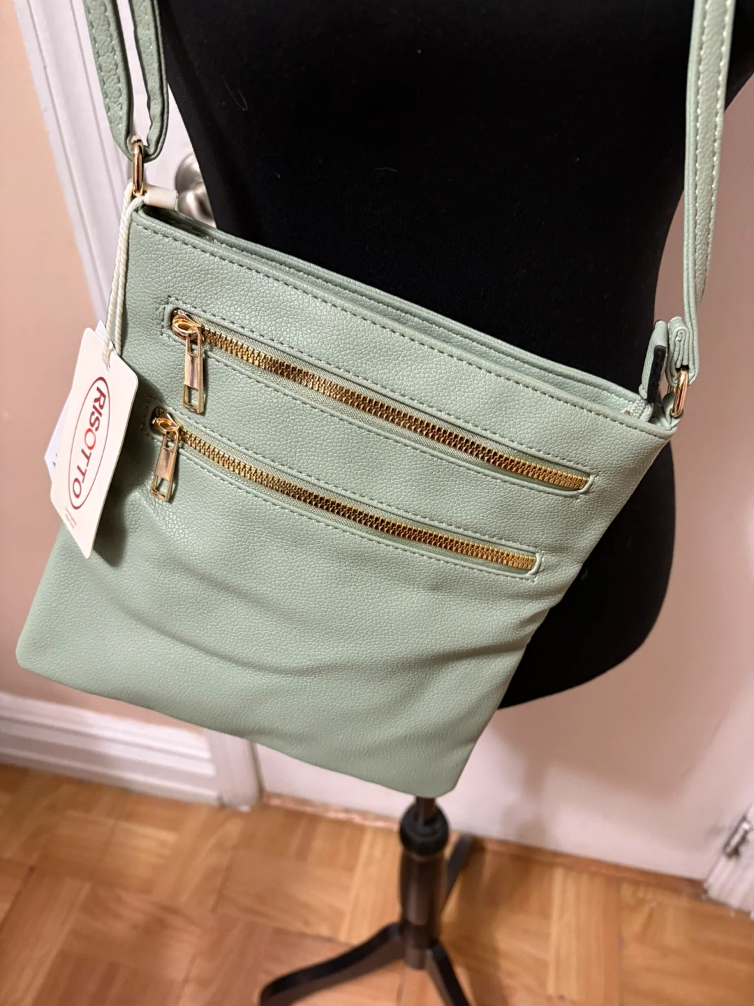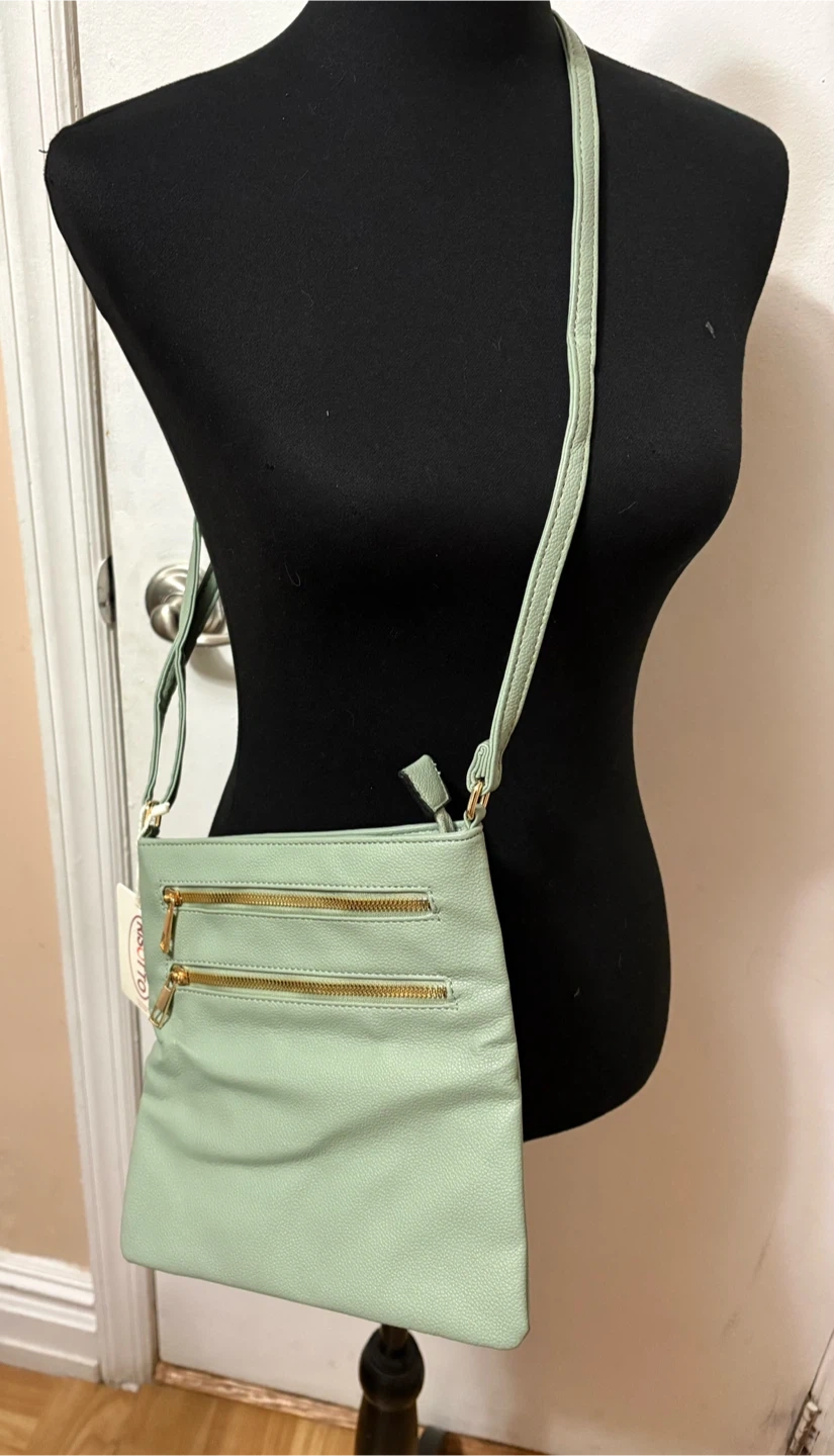 This is a mint green crossbody bag from Risotto. It's PETA-approved vegan material and features multiple zippered compartments. The interior has a striped lining.