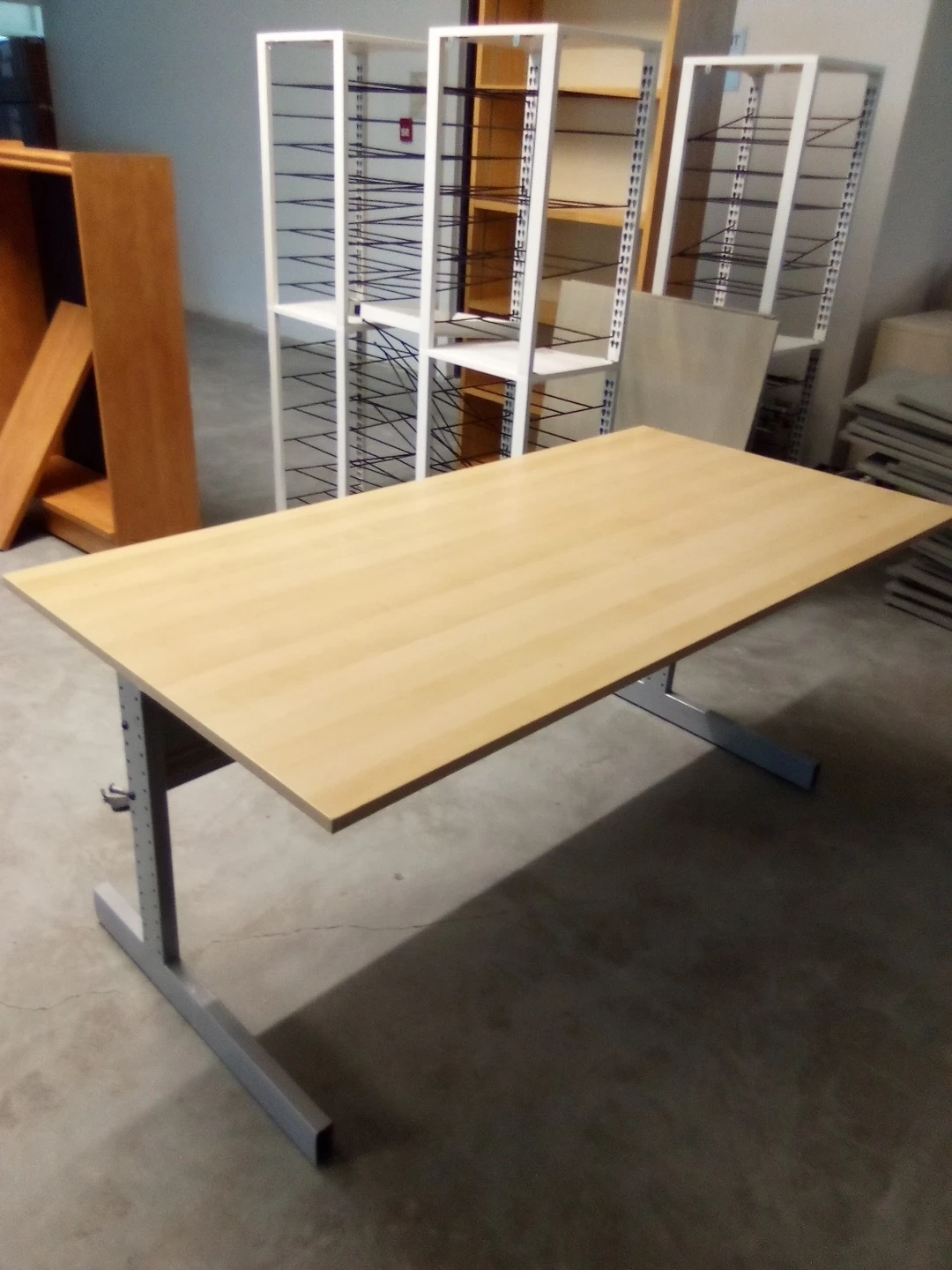 This office desk features a light maple laminate top and sturdy grey metal legs. It's spacious enough for a workspace and would be great for an office or home study. The simple design fits many decors.