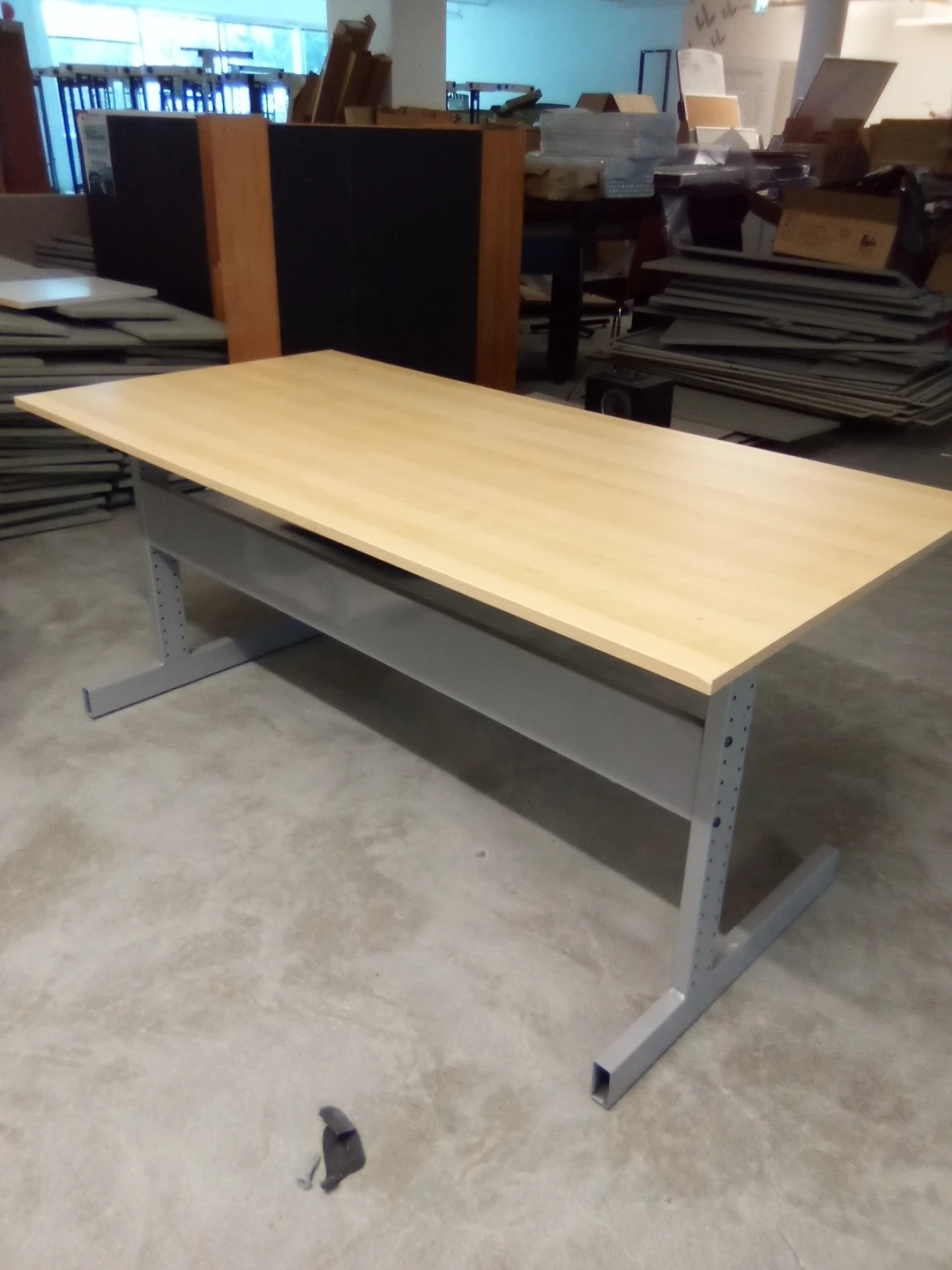 This office desk features a light maple laminate top and sturdy grey metal legs. It's spacious enough for a workspace and would be great for an office or home study. The simple design fits many decors.