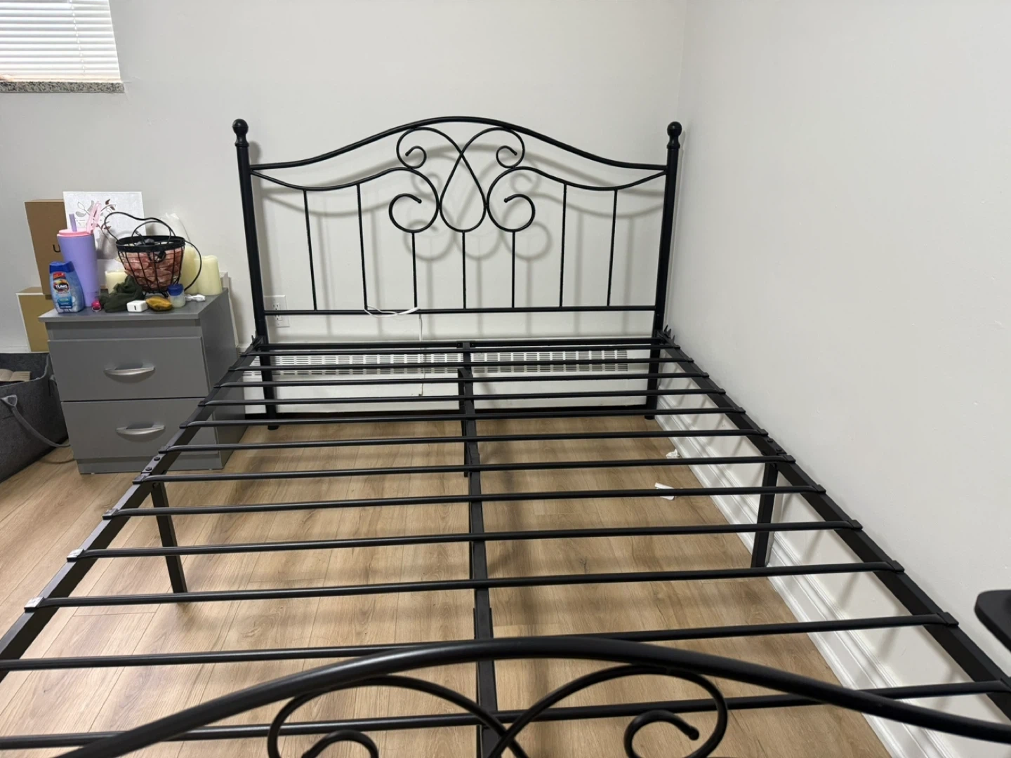 Sturdy black metal bed frame featuring a decorative scrolled headboard. It's designed for durability with strong support slats. This frame is a great option for adding a touch of classic style to any bedroom.