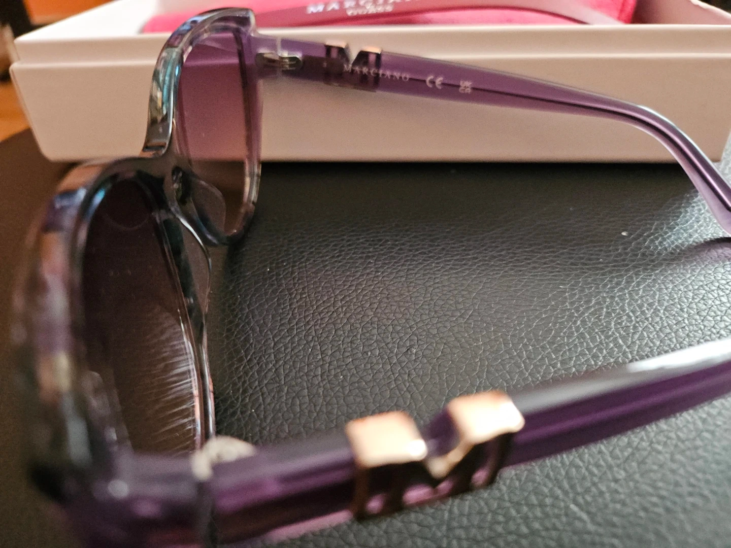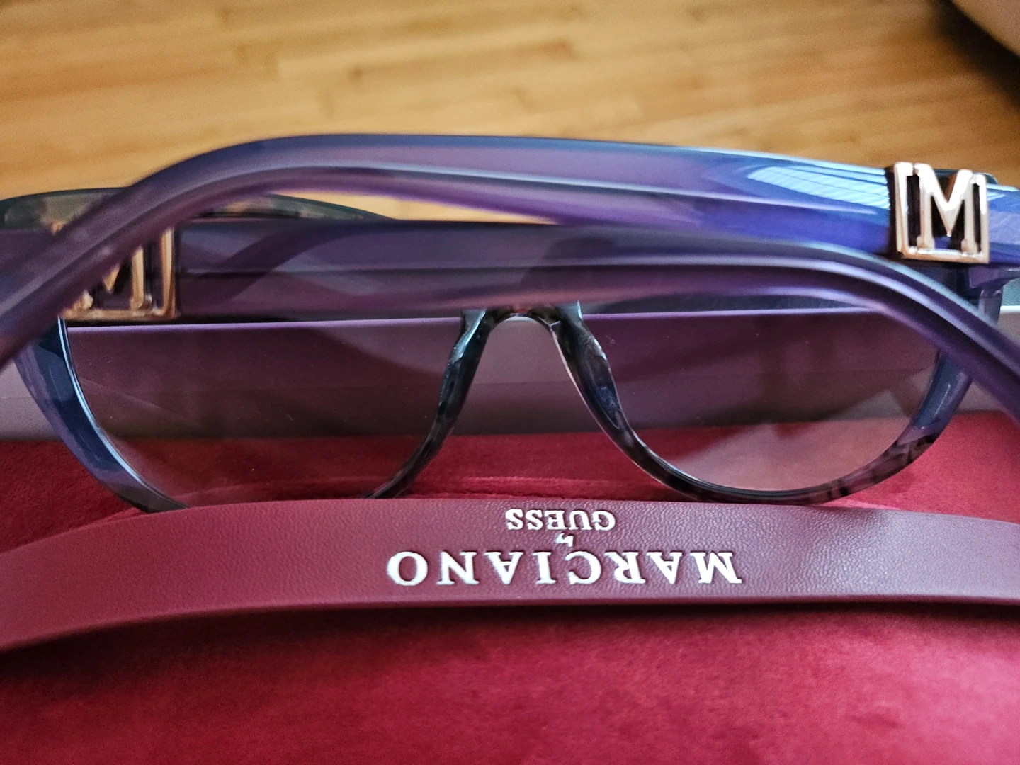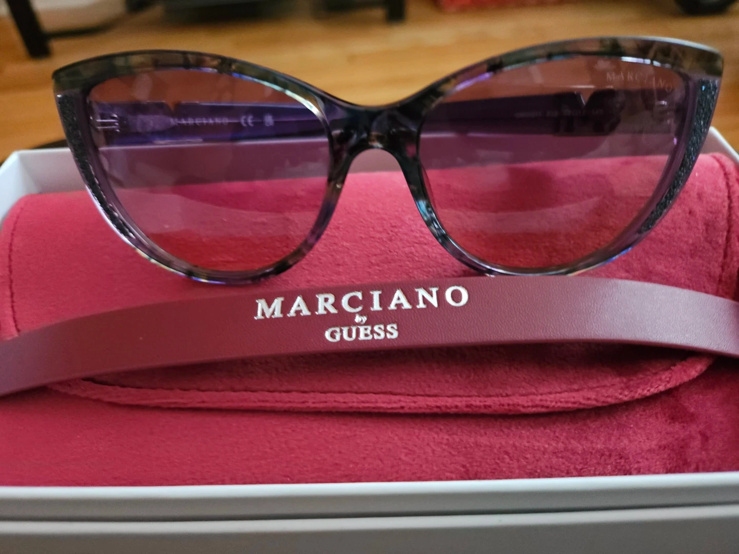 These stylish GUESS Marciano sunglasses feature a fashionable cat-eye shape. The frames have a subtle tortoise and purple marbled pattern, and the arms are a deep purple. They come with their original case and cloth.