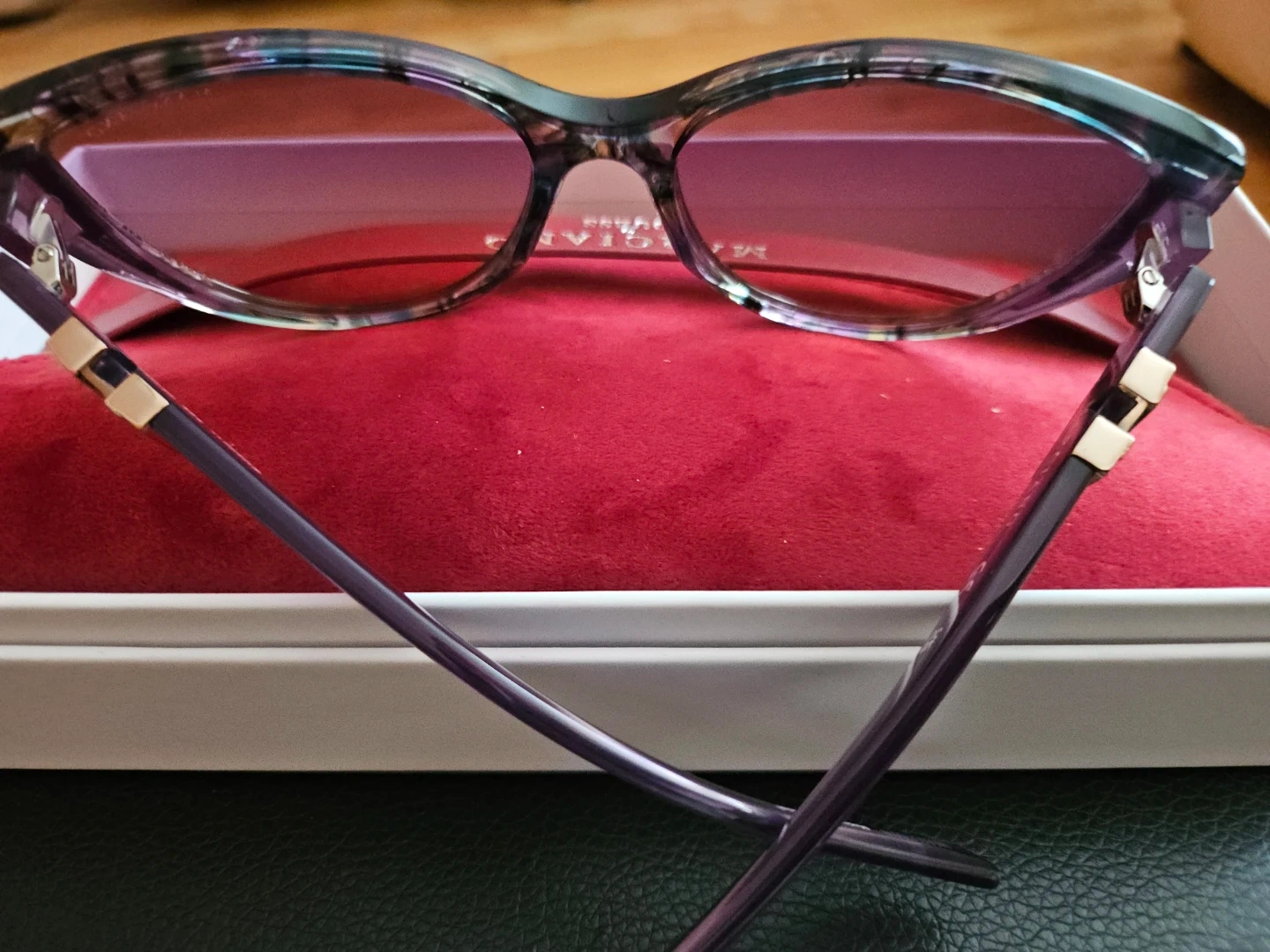 These stylish GUESS Marciano sunglasses feature a fashionable cat-eye shape. The frames have a subtle tortoise and purple marbled pattern, and the arms are a deep purple. They come with their original case and cloth.