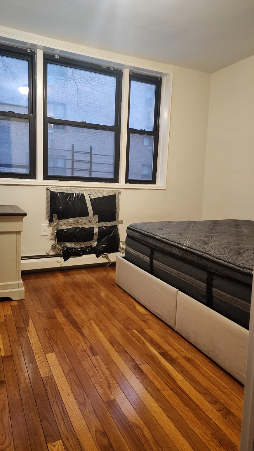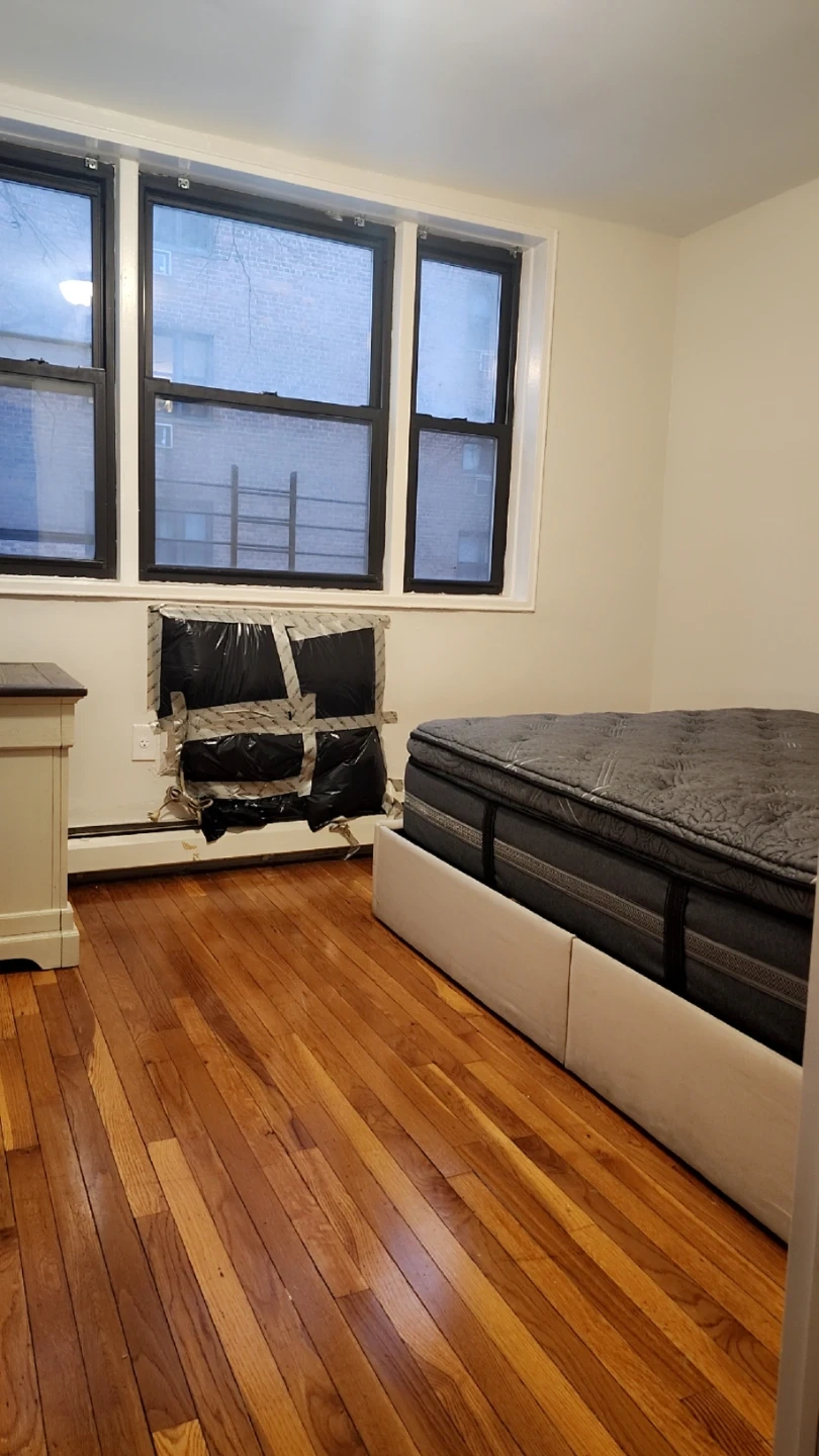 This bedroom features gleaming hardwood floors throughout. It includes a ceiling fan for air circulation and a spacious closet with sliding doors for storage. A window air conditioning unit is also present for cooling. Se aceptan niños es para pareja o persona sola