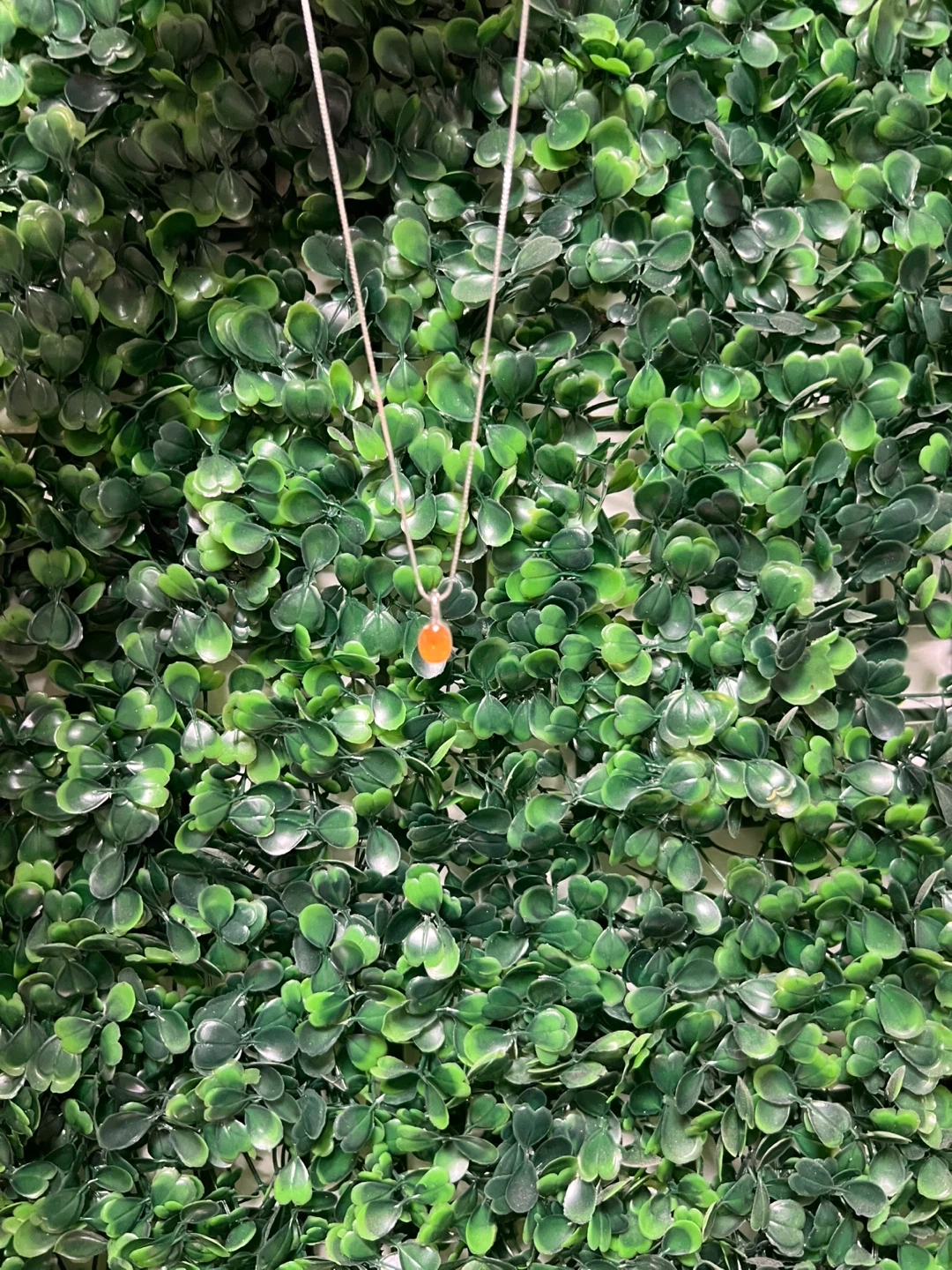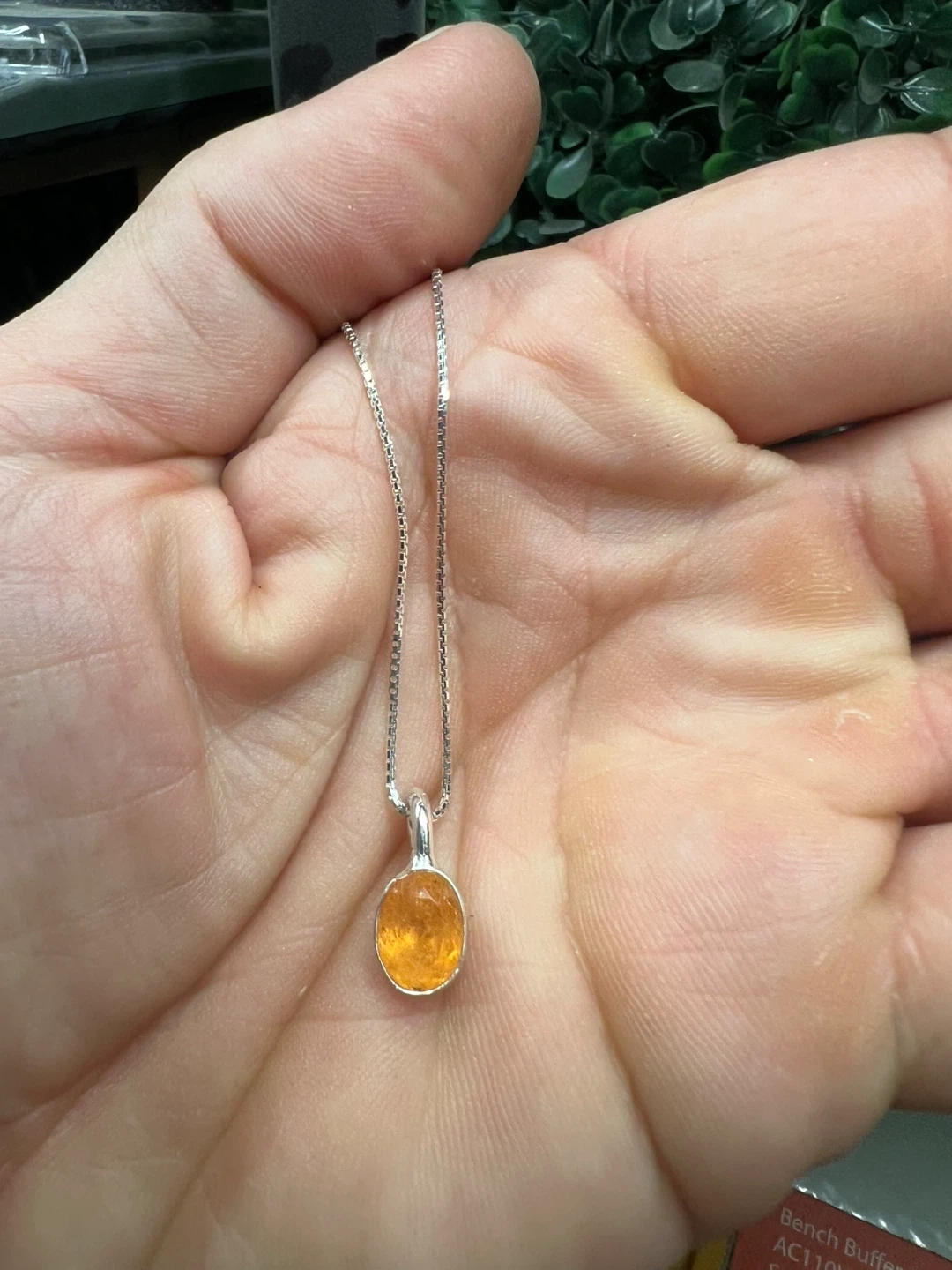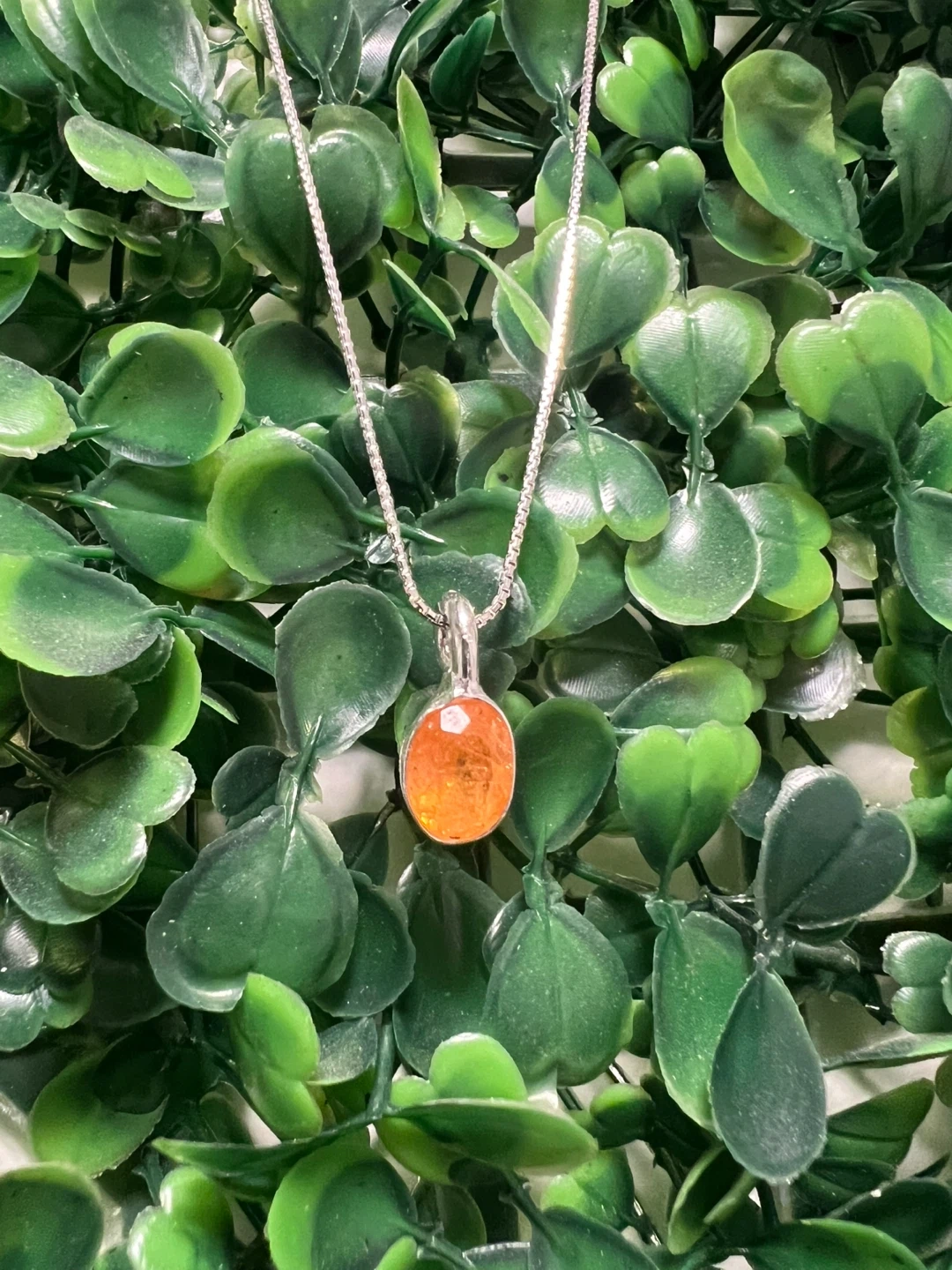 This necklace features a silver chain with an oval-shaped orange gemstone pendant. It's a lovely accessory for adding a pop of colour. The chain measures 18 inches.
