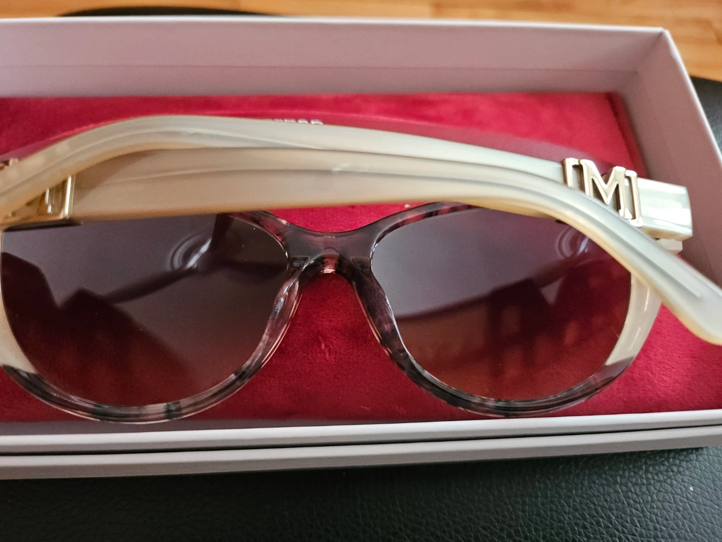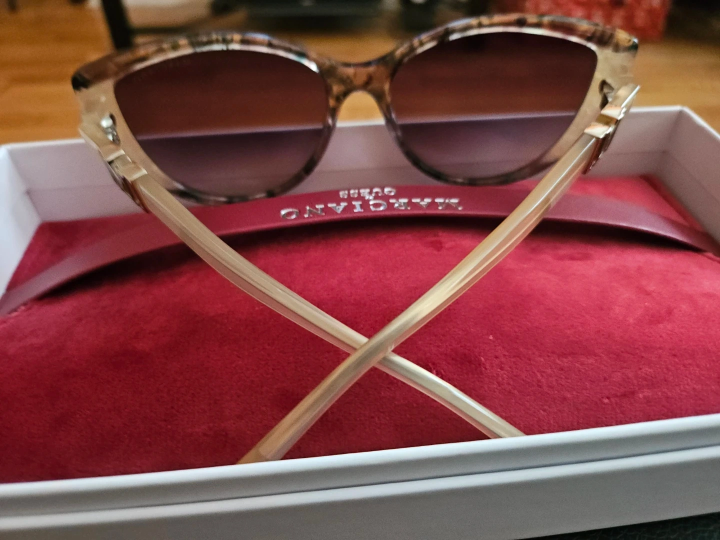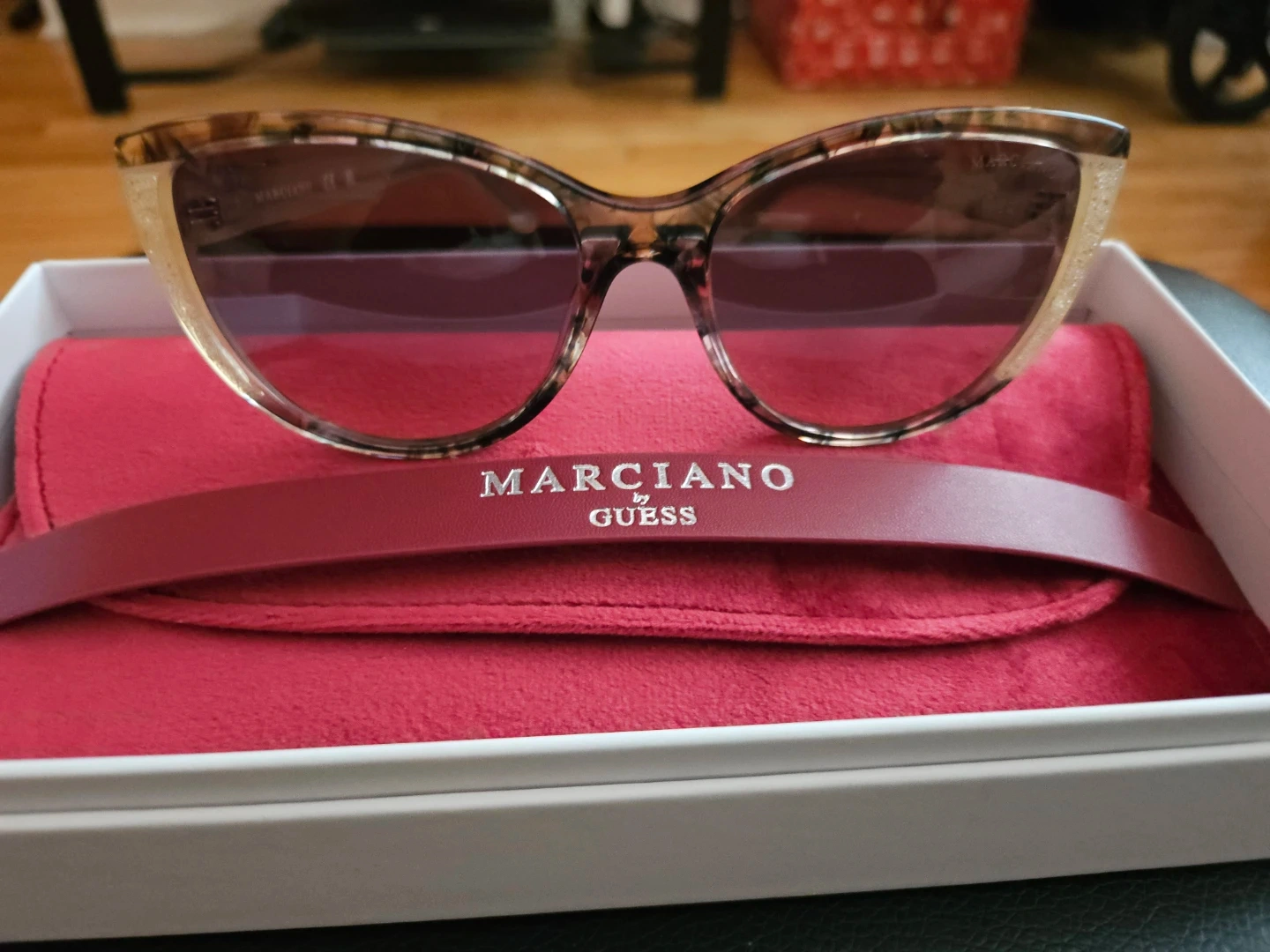 These GUESS MARCIANO cat eye sunglasses feature a tortoise shell pattern with glitter accents on the frames. They come with a protective red case and a red cleaning cloth. The lenses are tinted brown.