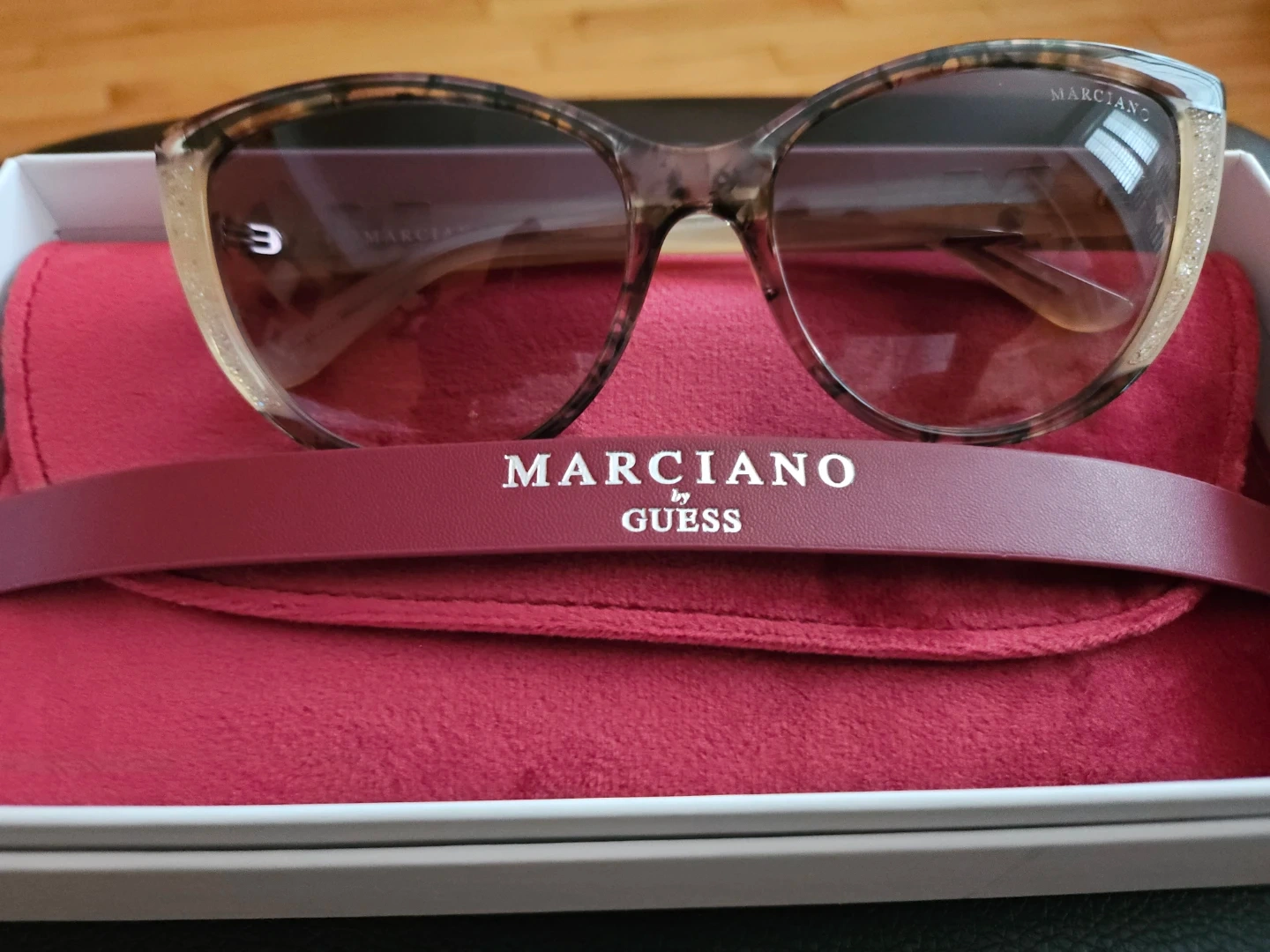 These GUESS MARCIANO cat eye sunglasses feature a tortoise shell pattern with glitter accents on the frames. They come with a protective red case and a red cleaning cloth. The lenses are tinted brown.