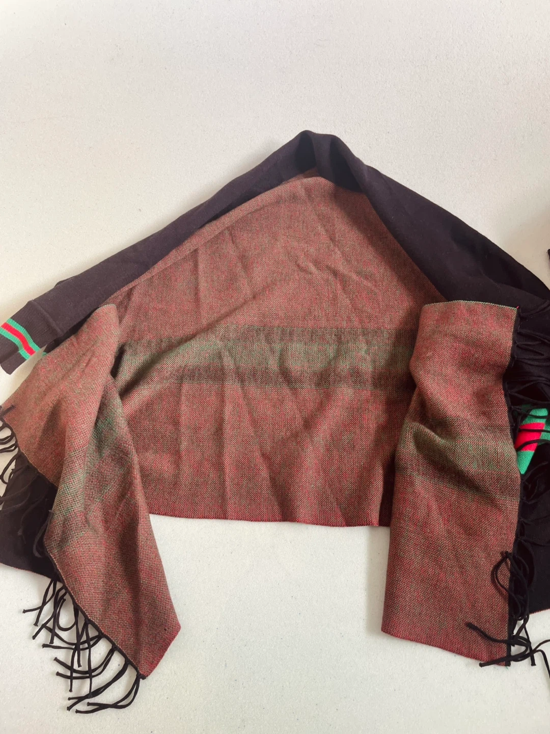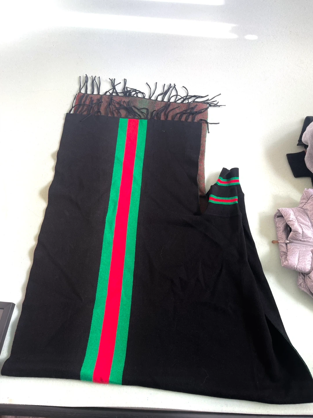 It's made with a comfortable knit material and has fringed edges. It's a stylish layering piece for cooler weather.