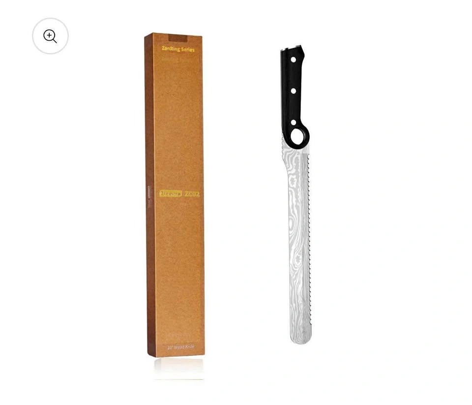 Brand new, never used. This 10-inch serrated knife features a full-tang construction with a durable 5Cr15MoV steel blade and an ergonomic Pakka wood handle. The unique finger ring offers enhanced safety and control, while the laser-etched Damascus pattern adds a touch of style. Perfect for slicing bread, fruits, and vegetables. Pickup in Milcroft, Burlington. No returns, please inspect during pickup. Check out my other listings for great deals on new items!