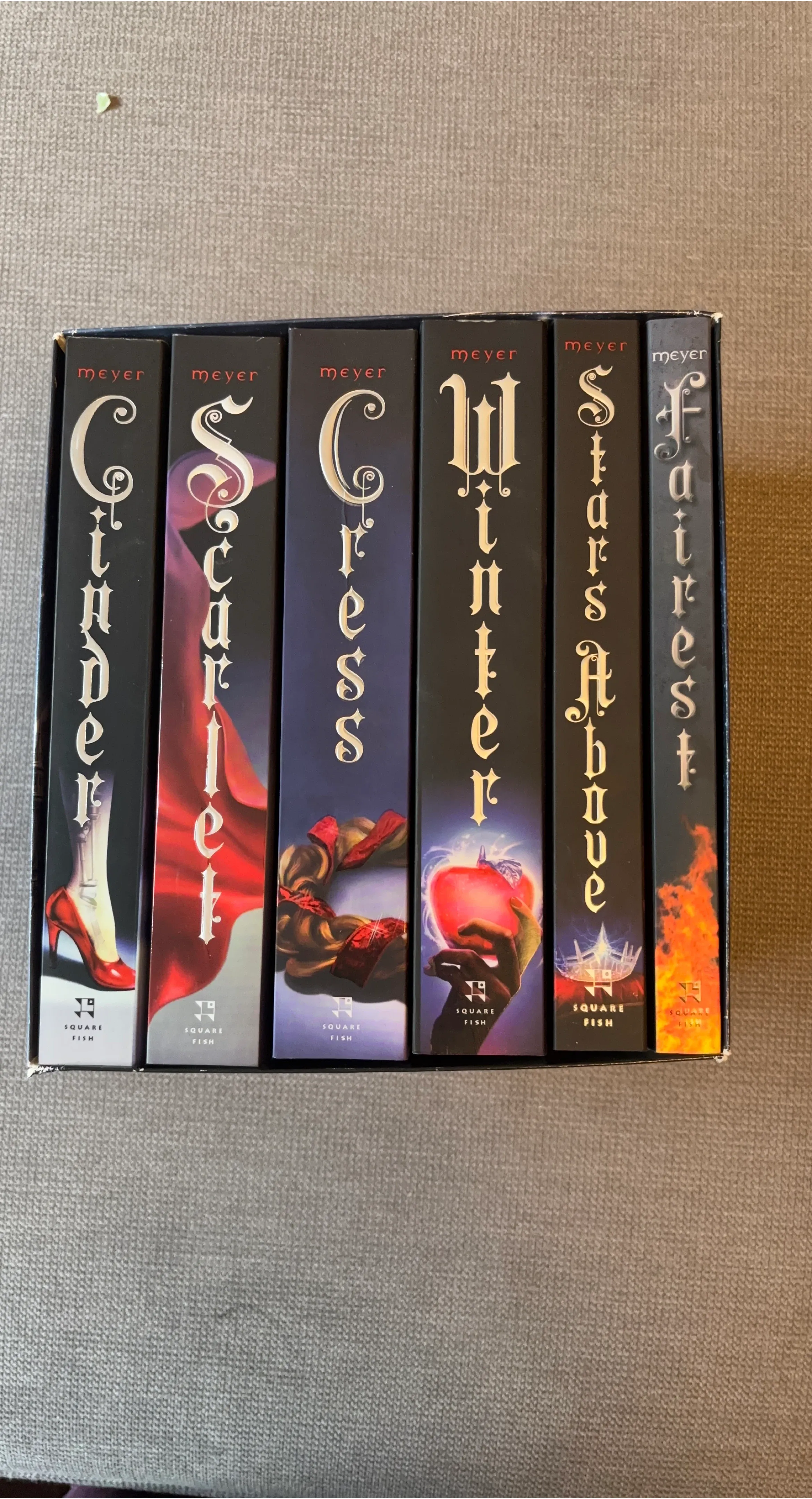 This box set includes all six books in The Lunar Chronicles series by Marissa Meyer. The books are Cinder, Scarlet, Cress, Winter, Stars Above, and Fairest. Perfect for fans of sci-fi and fairy tale retellings!