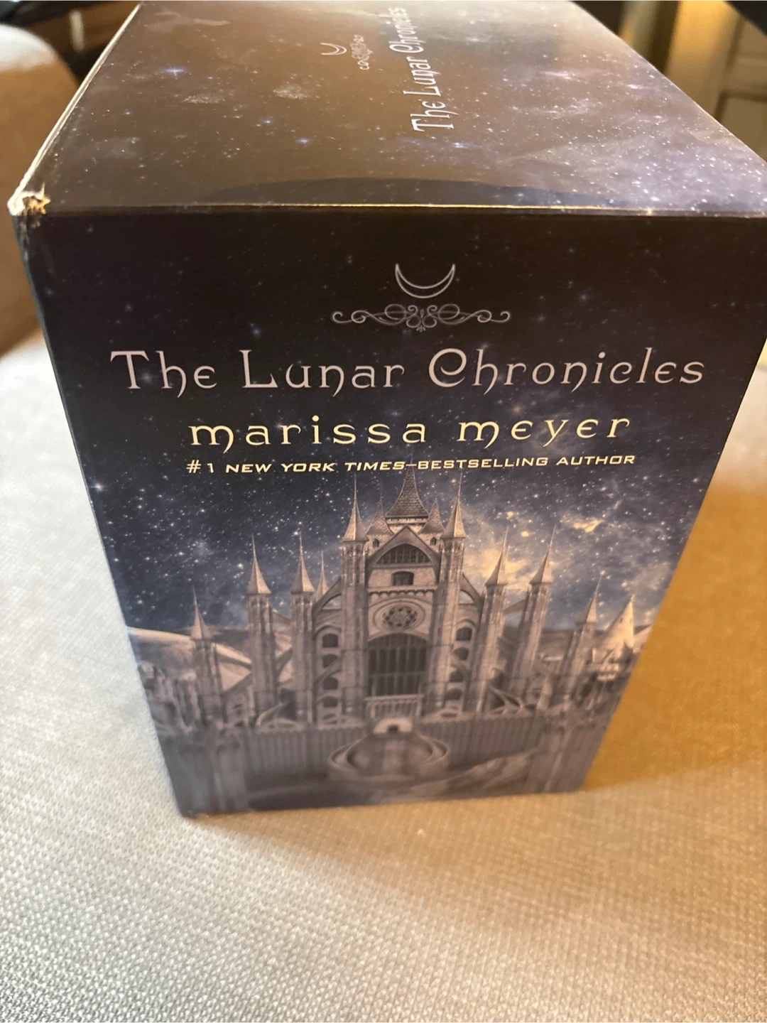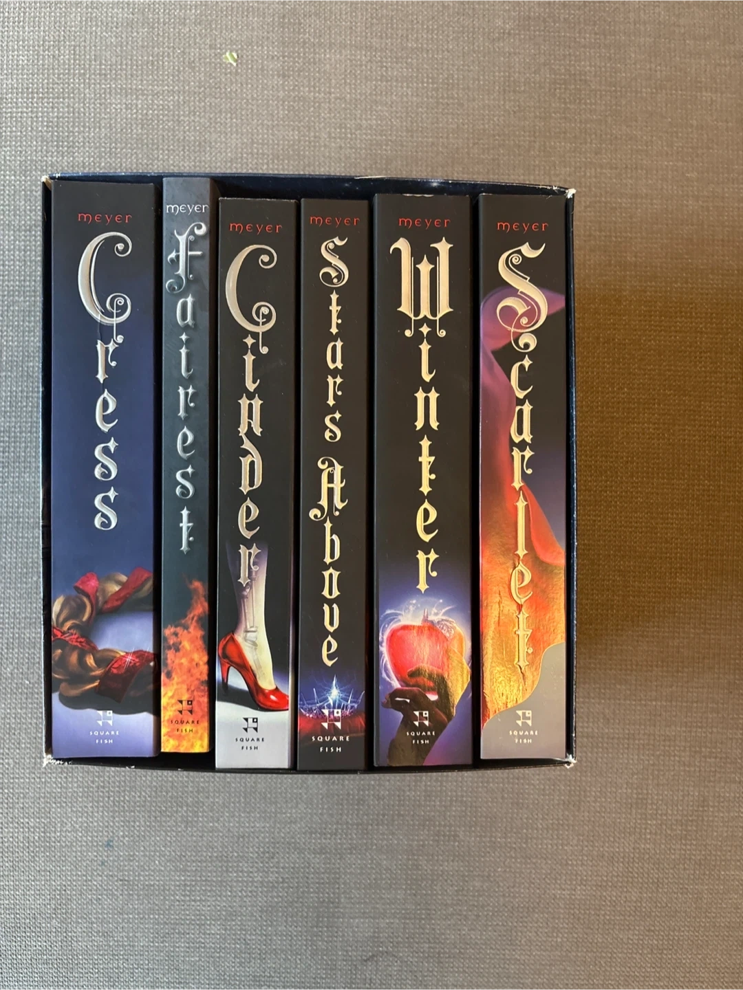 This box set includes all six books in The Lunar Chronicles series by Marissa Meyer. The books are Cinder, Scarlet, Cress, Winter, Stars Above, and Fairest. Perfect for fans of sci-fi and fairy tale retellings!