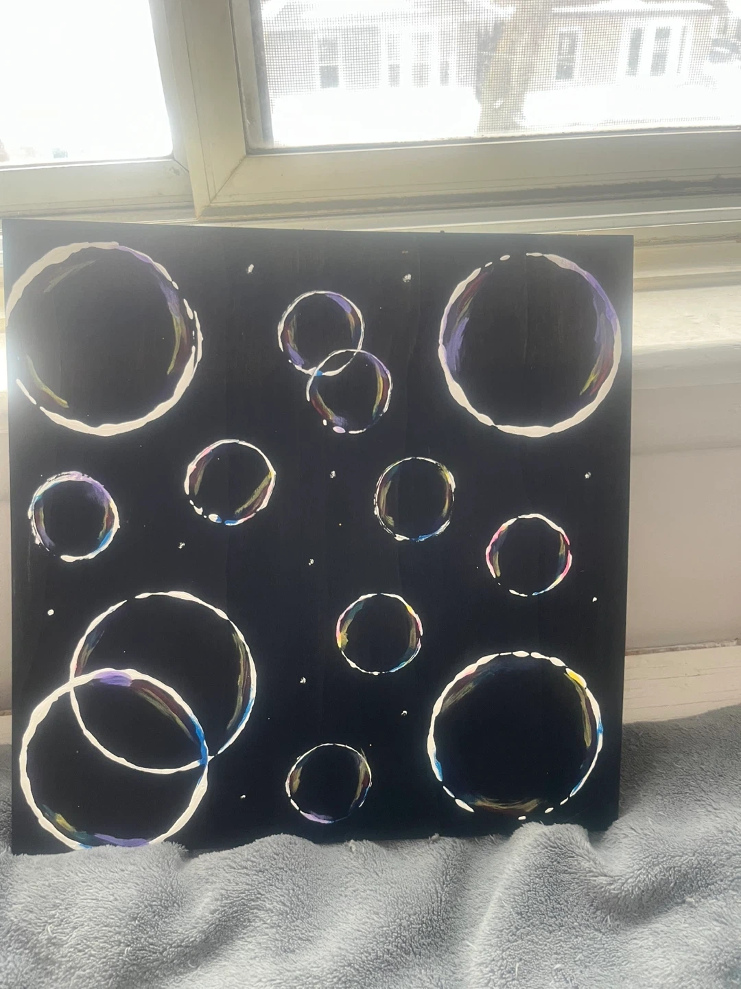 A black canvas featuring colourful bubble art. This painting uses acrylics to depict various sized bubbles with iridescent highlights. It's a unique piece for adding a pop of colour to any room!