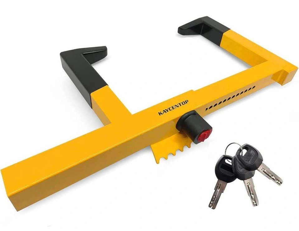 This KAYCENTOP wheel lock clamp provides security against theft for tires up to 15.5 inches wide. It's a universal fit for trailers, SUVs, boats, motorcycles, and golf carts. The lock is yellow and black.