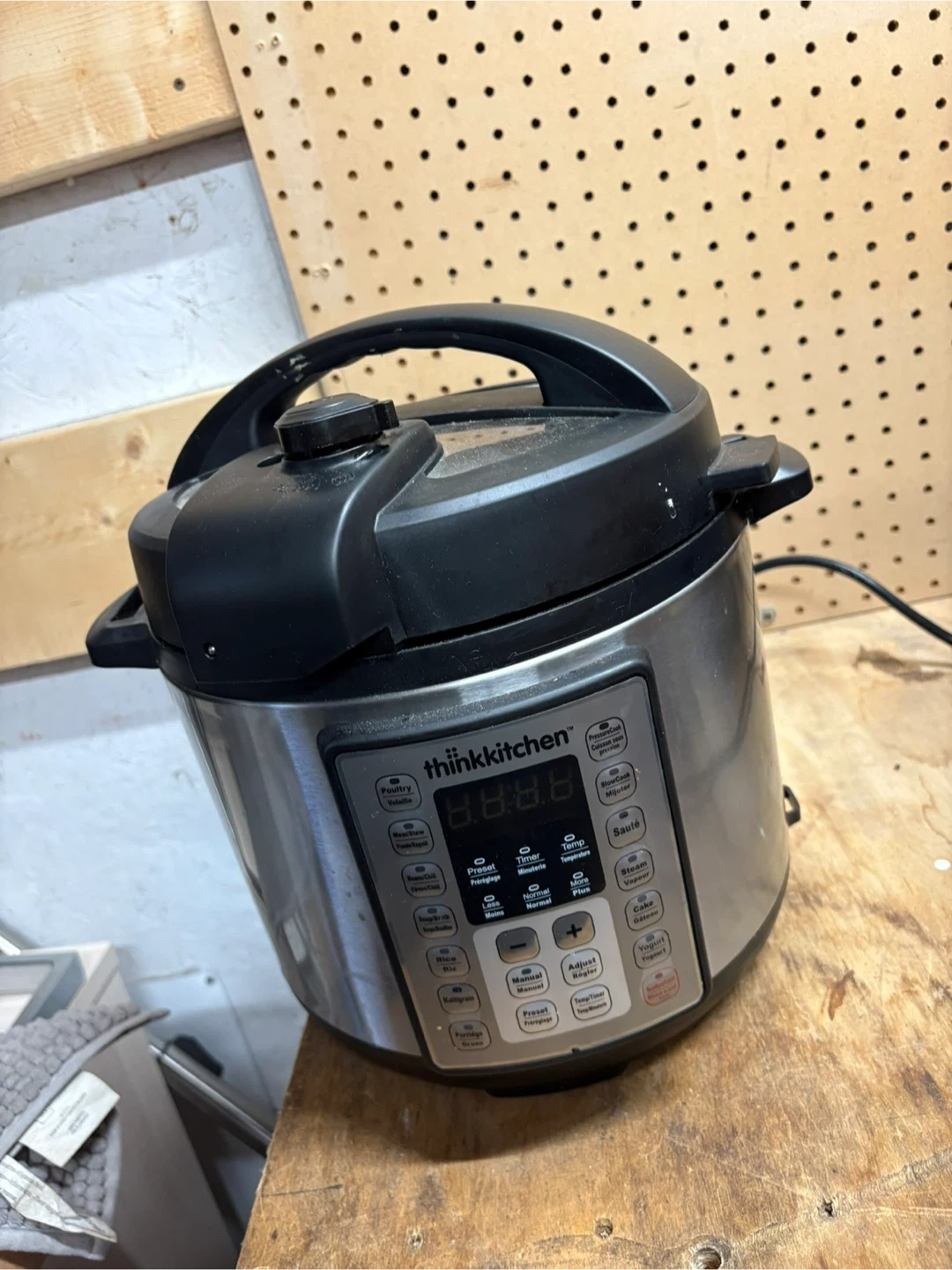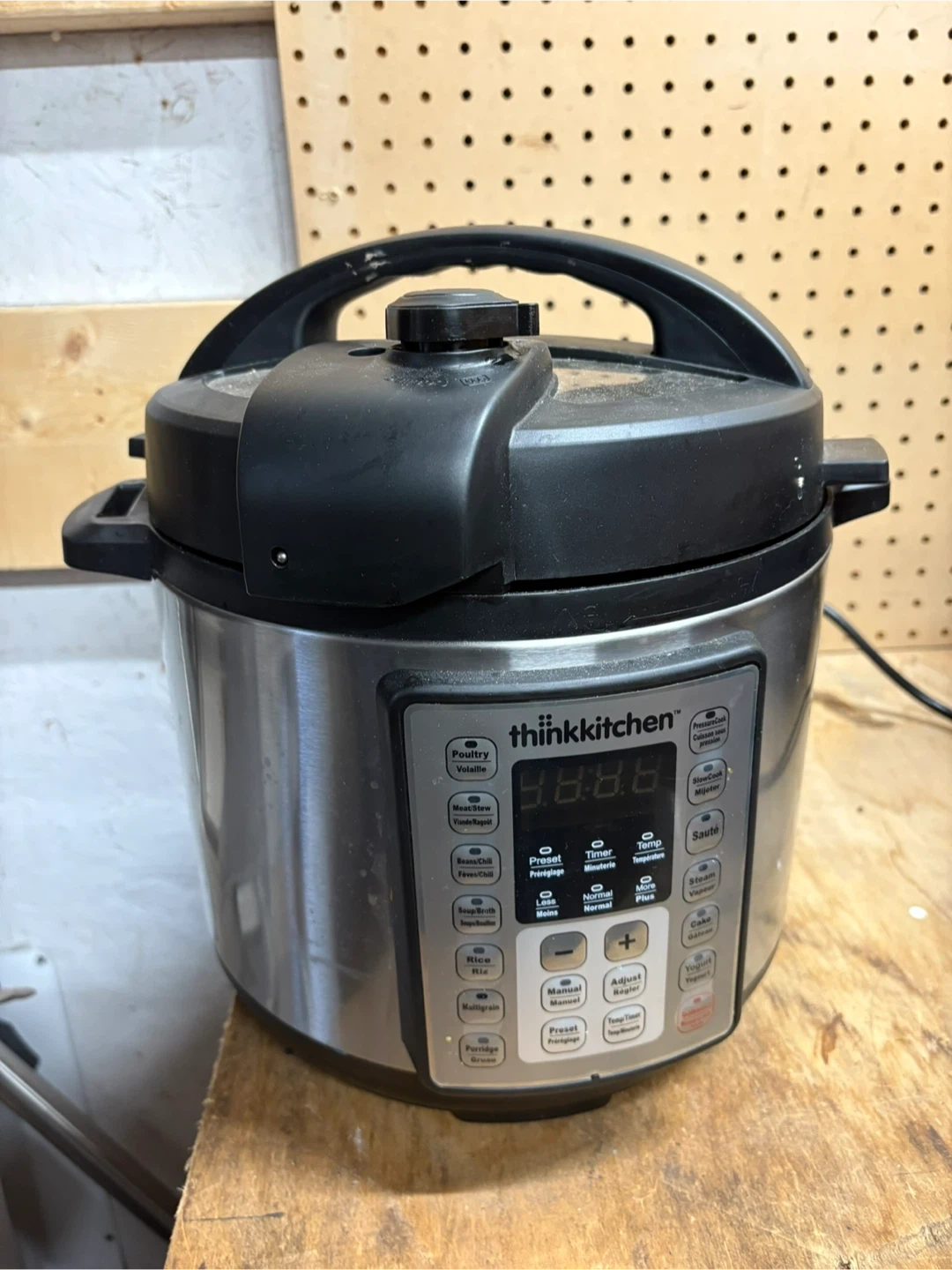 This Thinkkitchen pressure cooker is a versatile kitchen appliance. It offers multiple cooking functions and settings for various meals. Stainless steel and black finish.