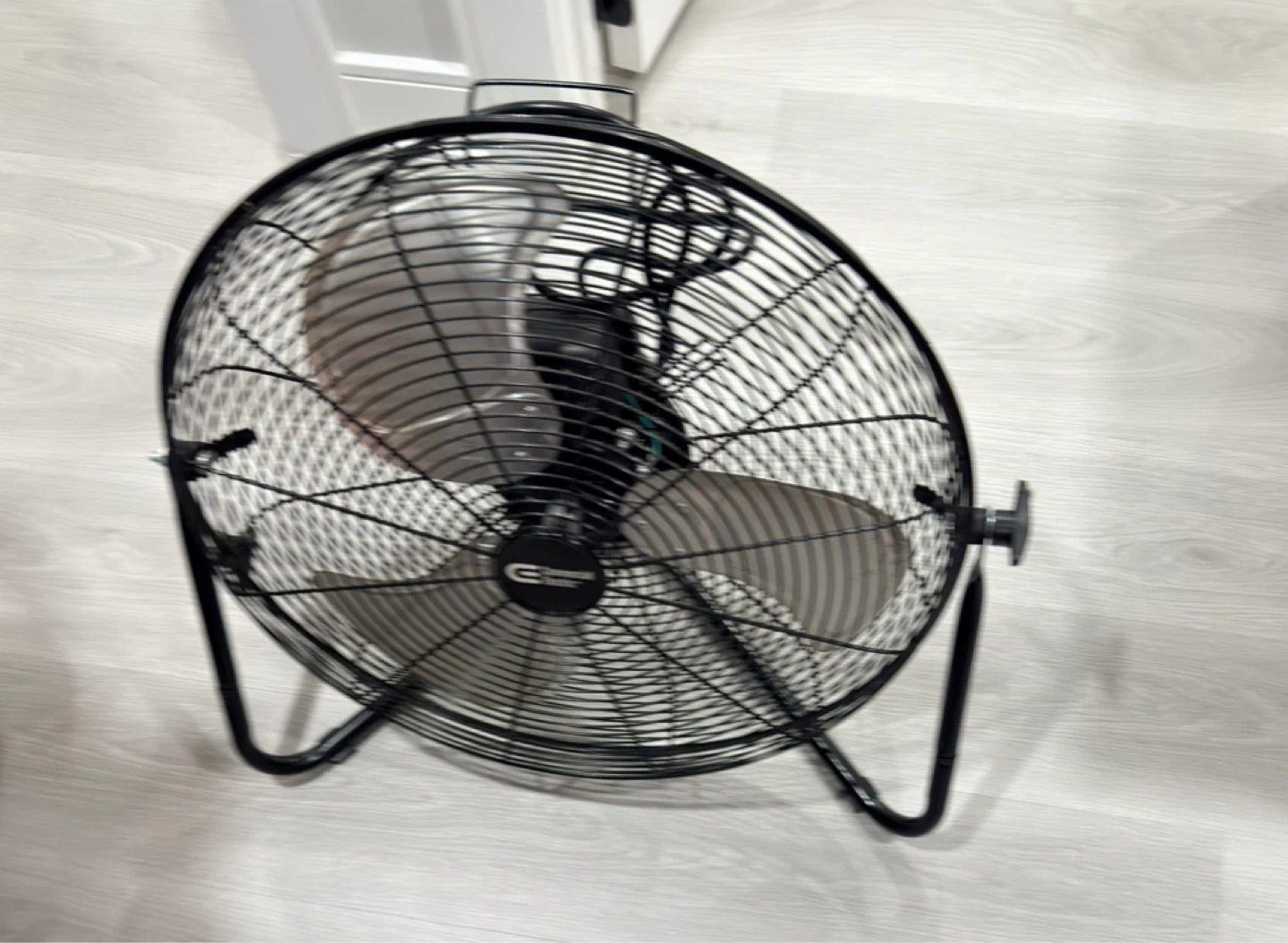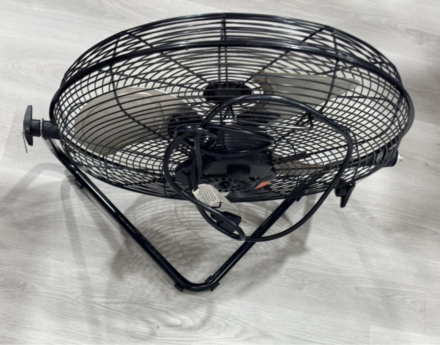Sturdy black metal floor fan. It has a powerful motor and adjustable tilt. Great for circulating air in any room! For the warmer weather summer is around the corner.