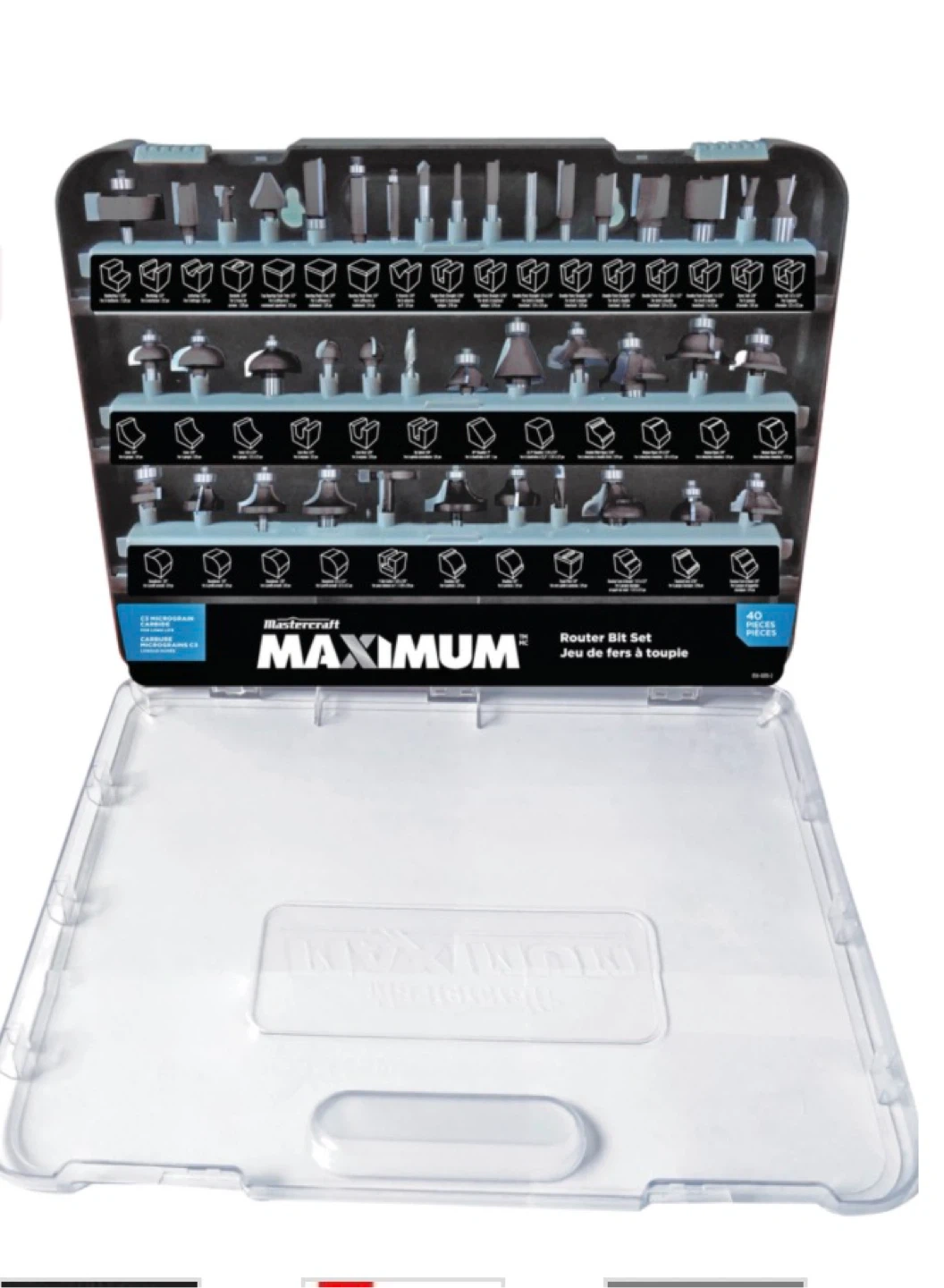 This is a 40-piece router bit set from Mastercraft Maximum. It includes various bit shapes and sizes for different woodworking tasks. The set comes in a durable carrying case.