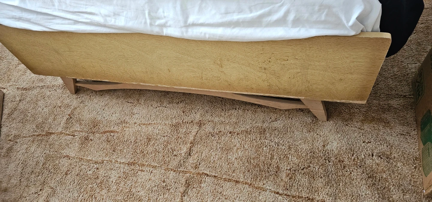 This set includes a tall dresser, a wide dresser, and a headboard with storage. They're made of light wood with brass-toned hardware. The headboard has two cabinet spaces and an open shelf. This bedroom set would be a nice addition to a retro-themed room!