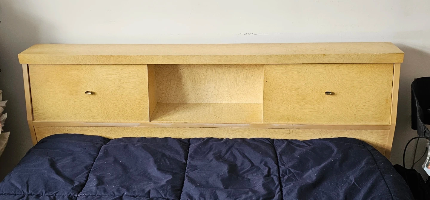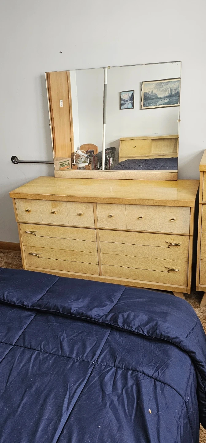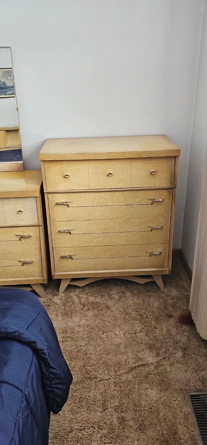 This set includes a tall dresser, a wide dresser, and a headboard with storage. They're made of light wood with brass-toned hardware. The headboard has two cabinet spaces and an open shelf. This bedroom set would be a nice addition to a retro-themed room!