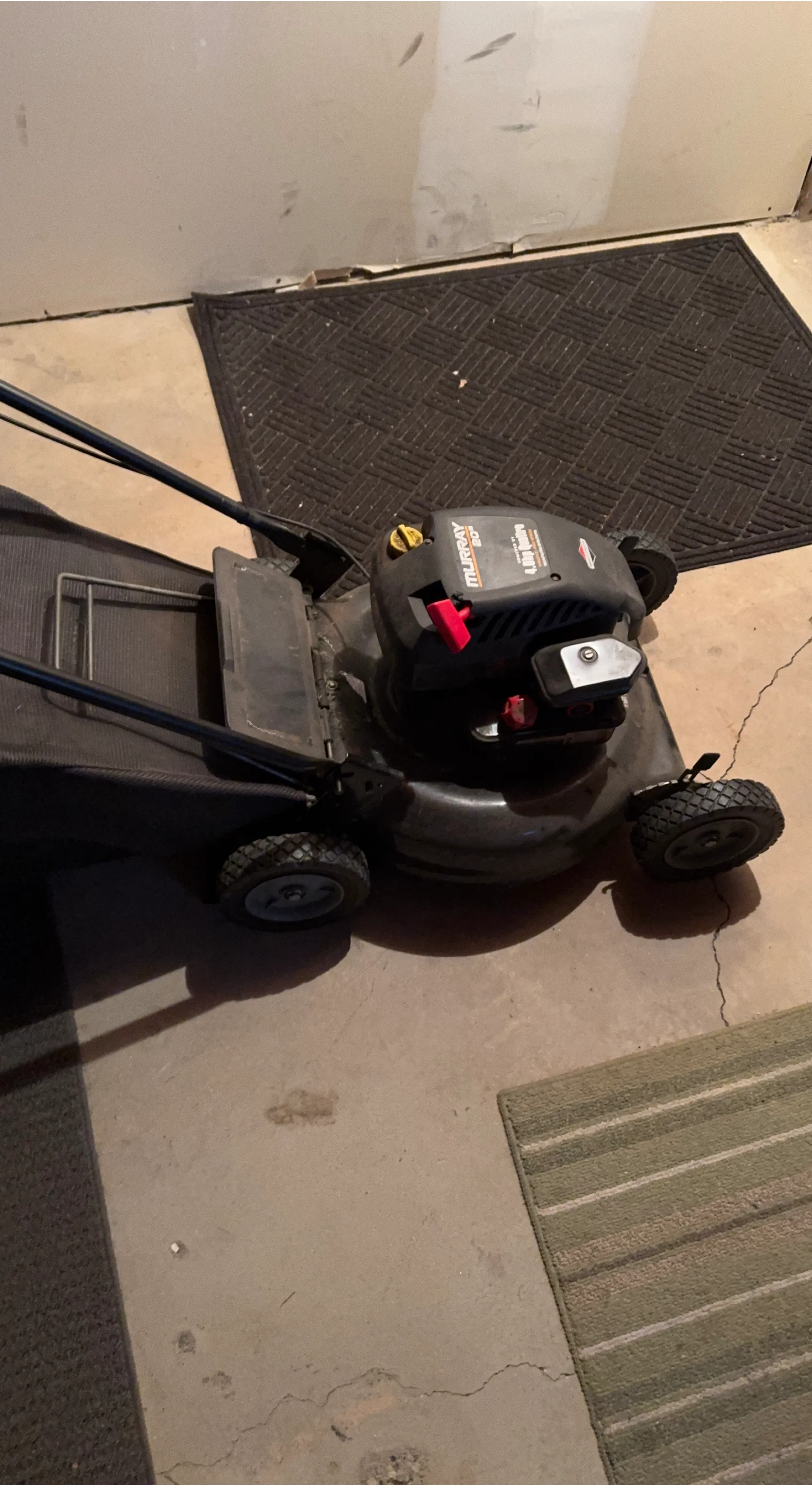Murray push lawn mower powered by a Briggs & Stratton 4.0hp Quattro engine. It's a 20-inch cutting deck with a rear bagger. This mower is suitable for maintaining your lawn.