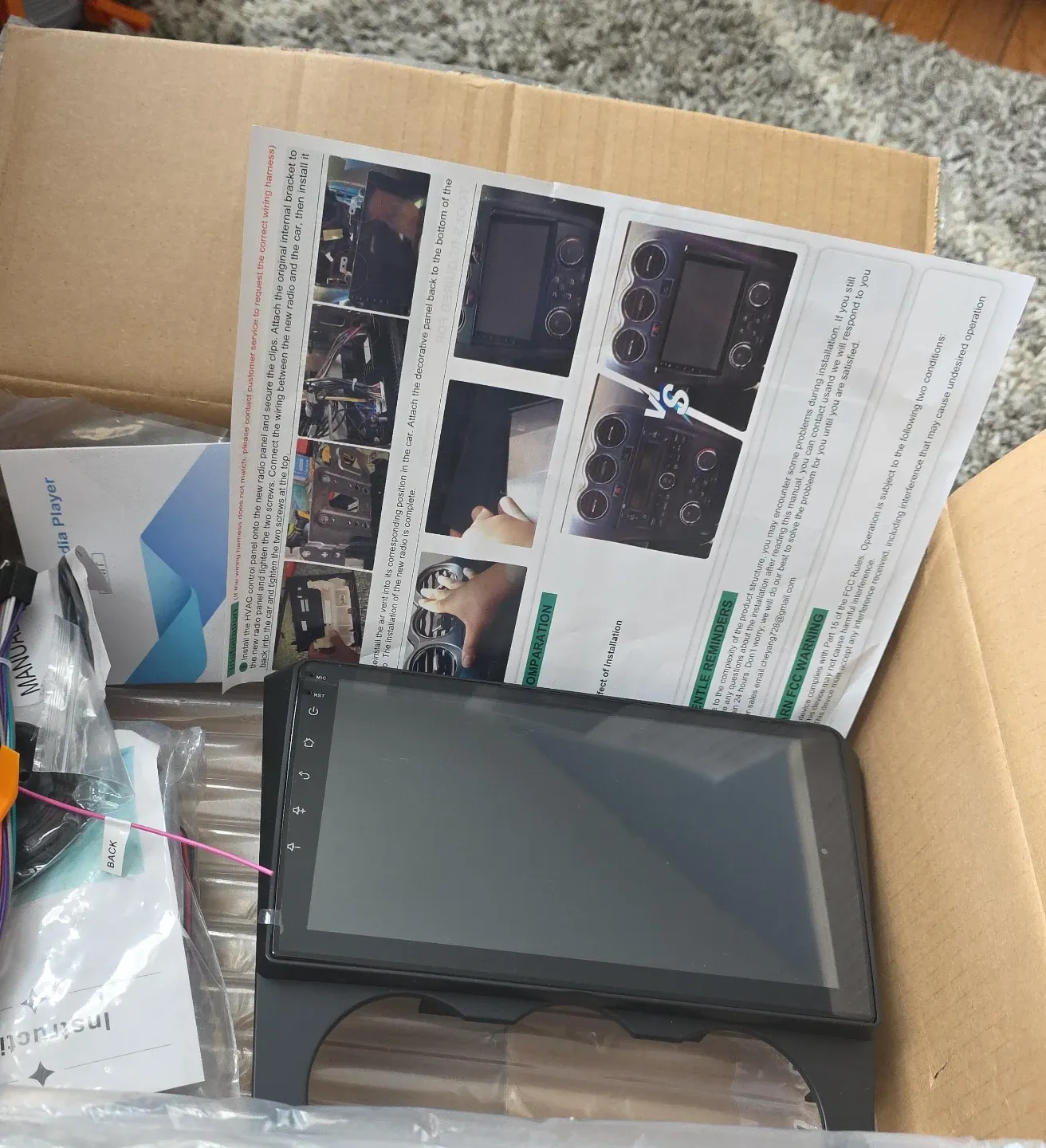 This is a car multimedia player with a touchscreen. It includes a manual for installation. Instructions cover connecting wiring and attaching panels. It's FCC compliant.