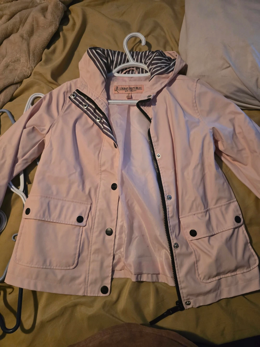 This is a pink hooded jacket from Urban Republic's girls collection. It's a size L (6X) and features a zip-up front with snap closures. The jacket has two flap pockets with snap closures on the front.