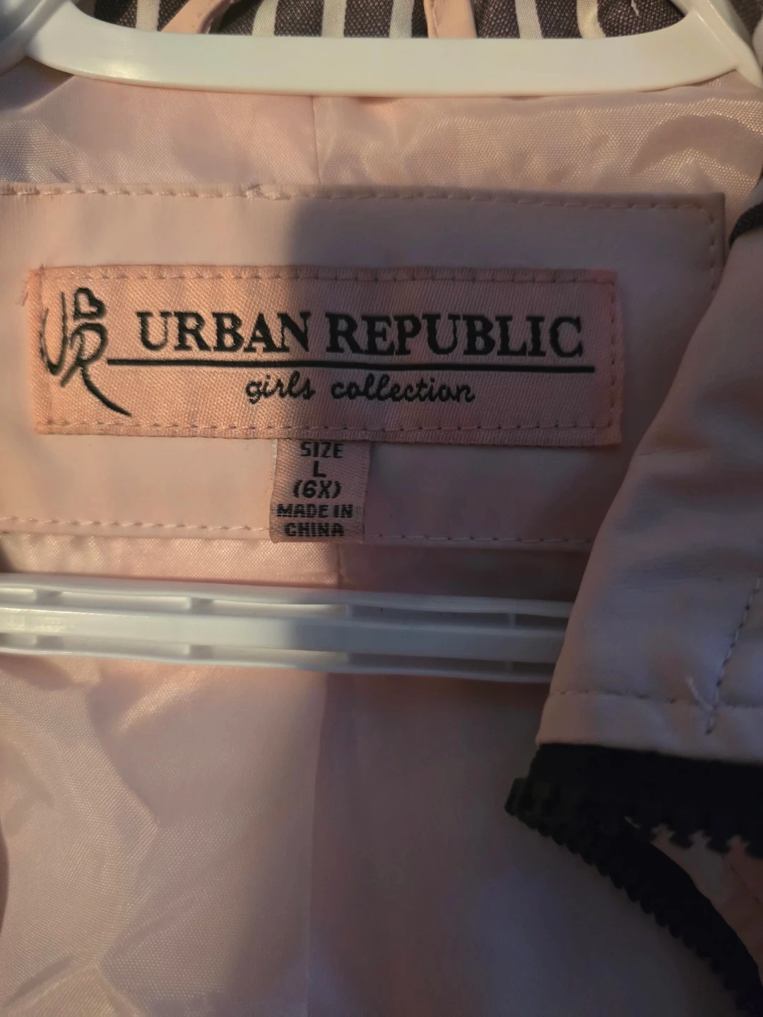 This is a pink hooded jacket from Urban Republic's girls collection. It's a size L (6X) and features a zip-up front with snap closures. The jacket has two flap pockets with snap closures on the front.