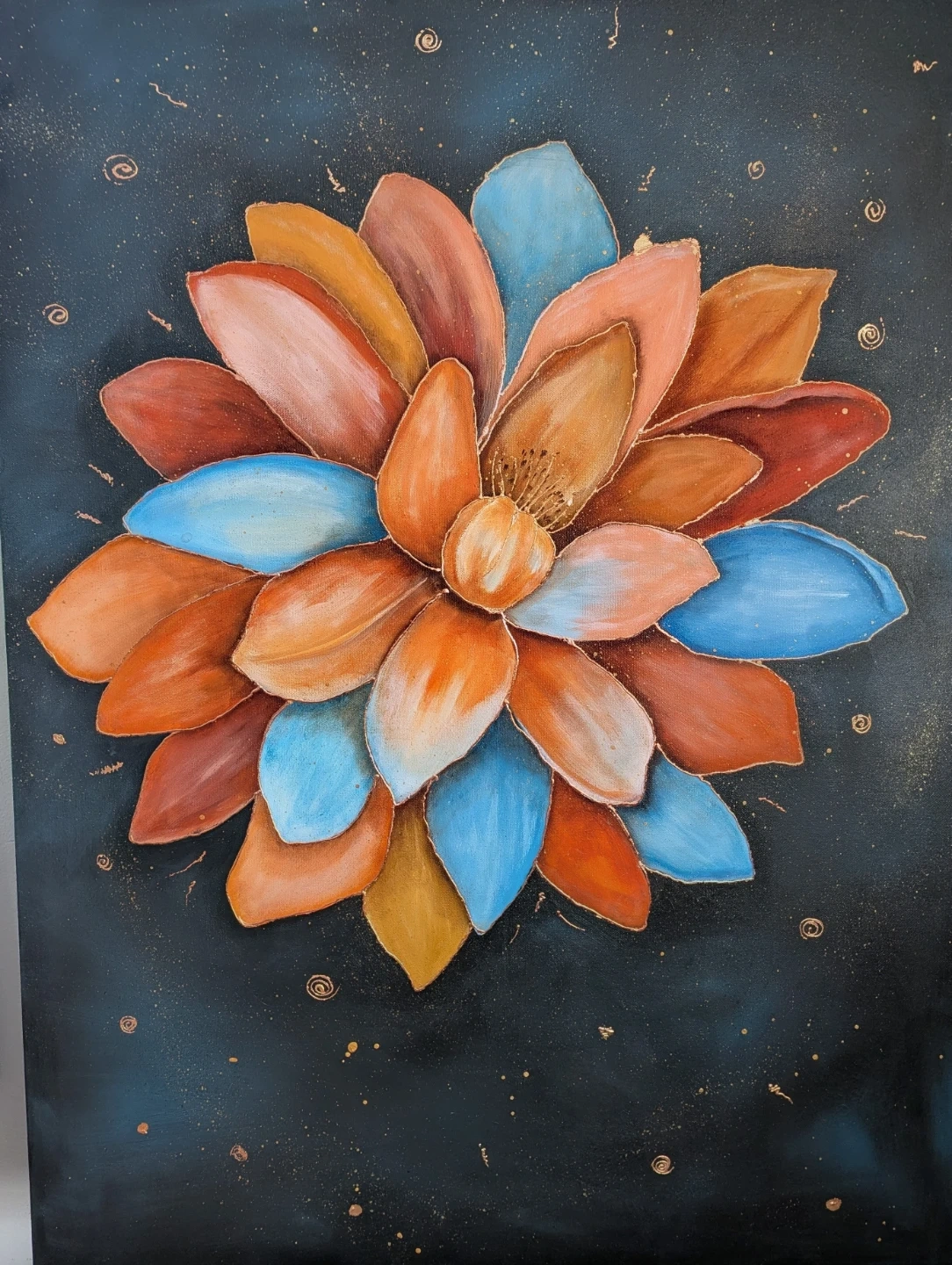 This is an original colourful acrylic abstract flower painting on canvas. It features bold strokes in orange, red, and blue hues against a dark background with copper flecks. It's perfect for adding a pop of colour to any room!