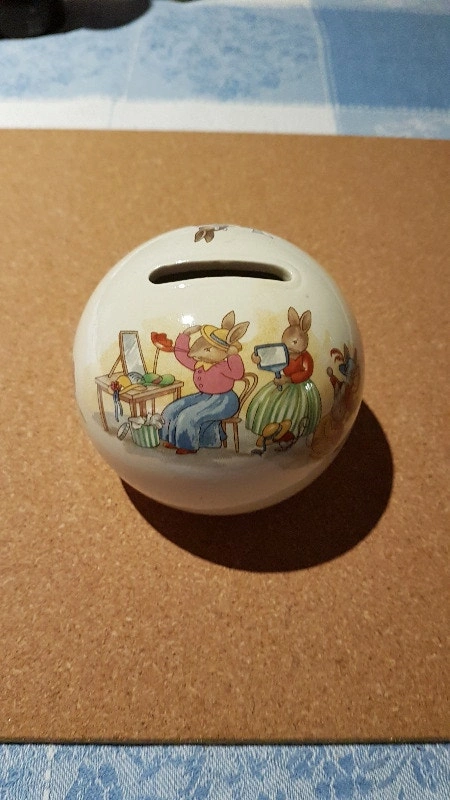 I have a Royal Doulton Bunnykins china, 3 inch diameter round piggy bank. The backstamp indicates it was manufactured in 1984. Let me know if you're interested!