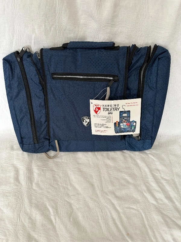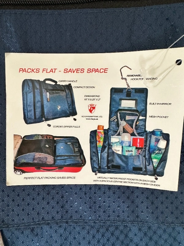 New Heys hanging toiletry bag, size 15"x9.25"x2". Features corded zipper pulls, flat packing for space-saving, a removable hook for hanging, a built-in mirror, and mesh pockets. It's virtually waterproof. For sale by owner.