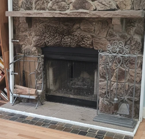 This metal fireplace tool set includes a shovel, brush, poker, and tongs, all housed on a decorative stand. A matching metal log holder is also included. Great for keeping your hearth tidy!