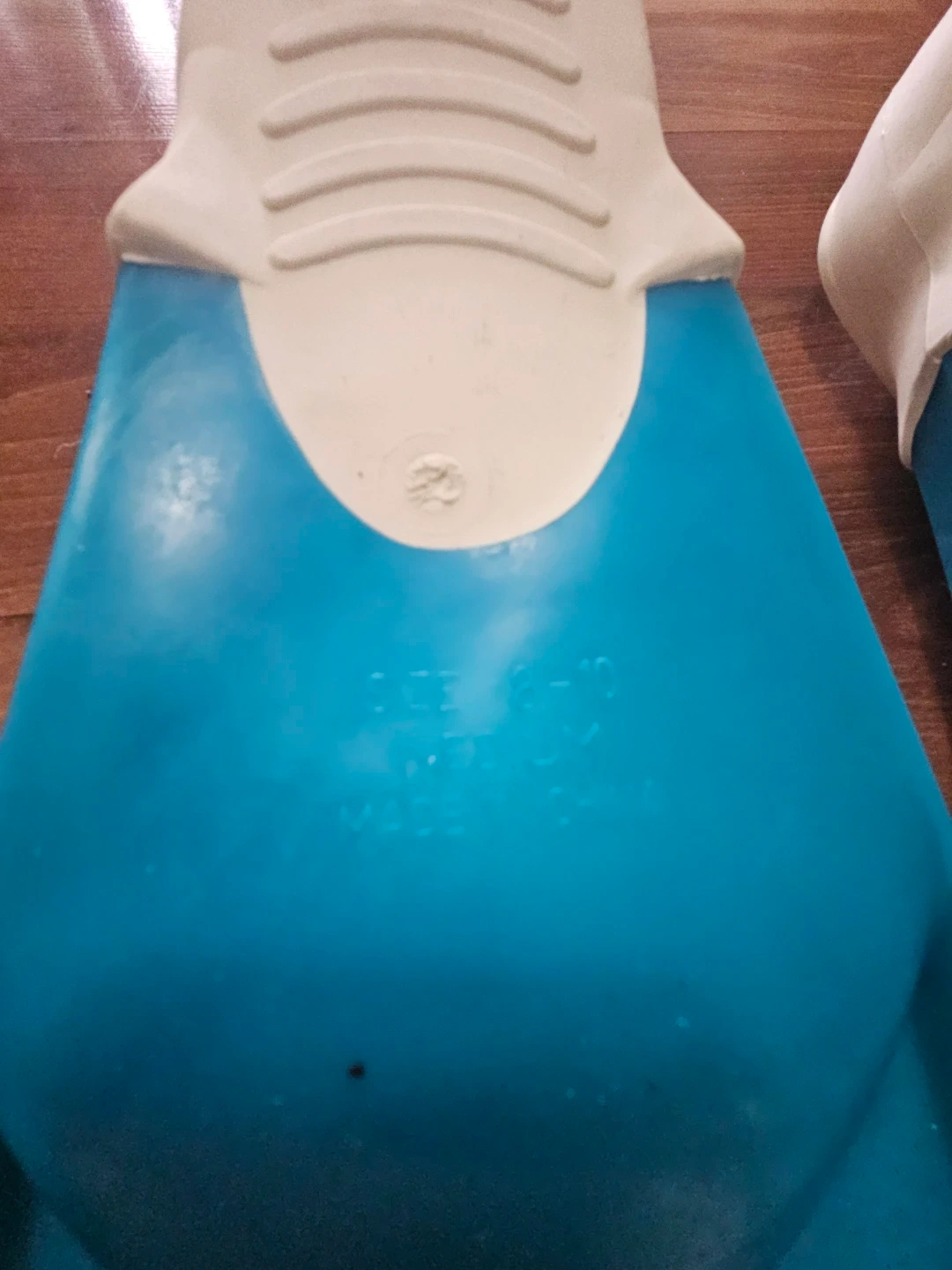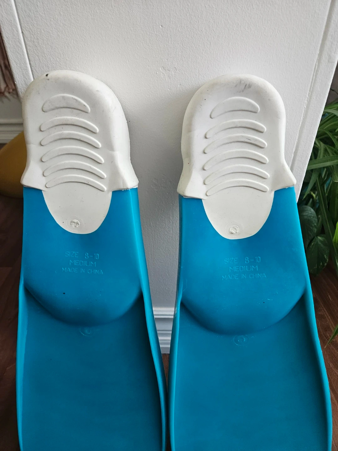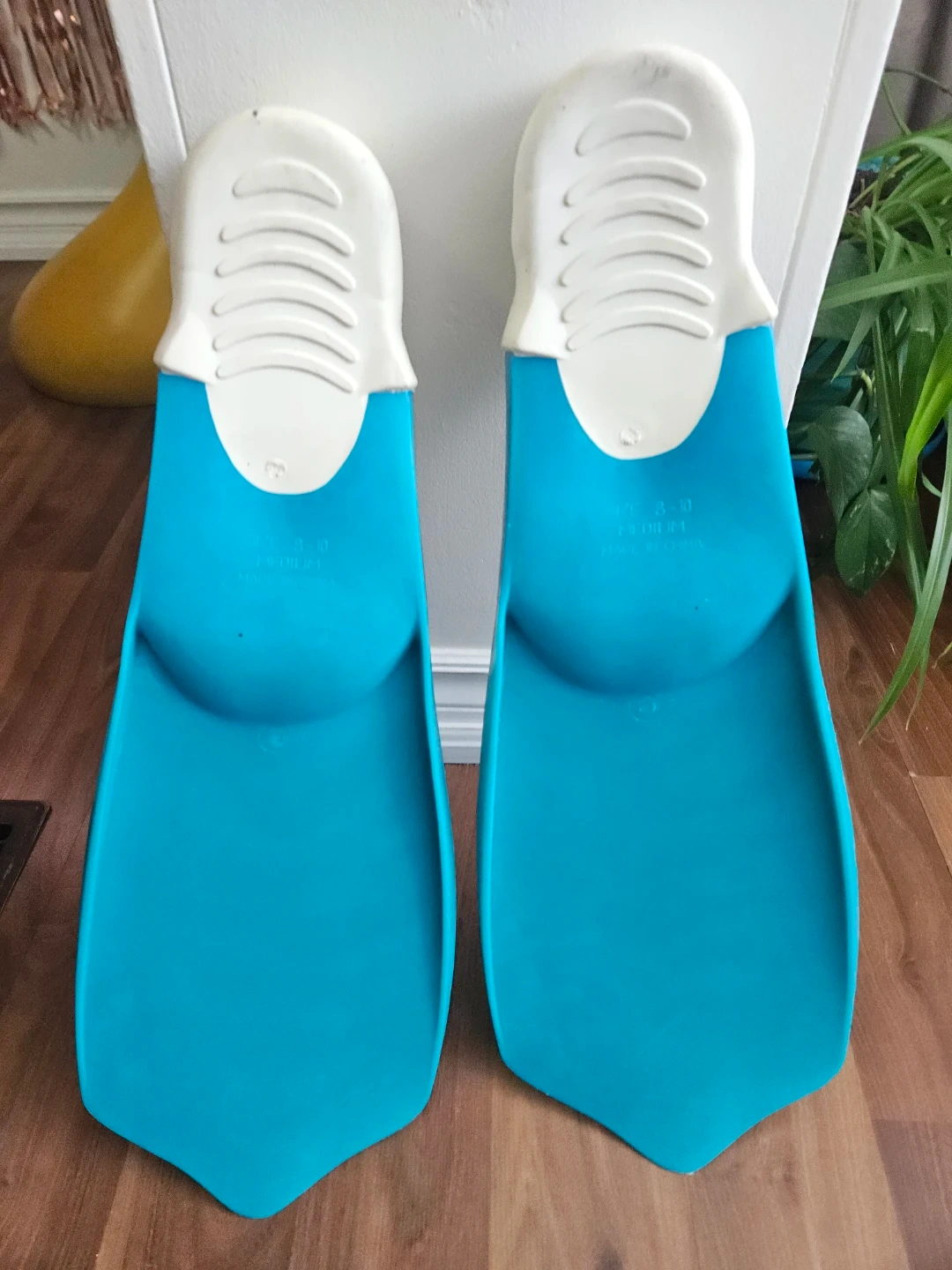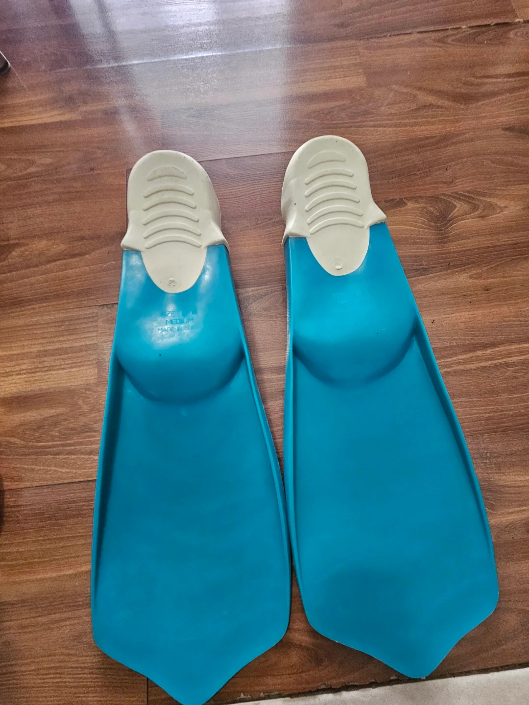 These blue swim fins are size medium, fitting shoe sizes 8-10. They're made of rubber and plastic. Ready for your next swim adventure!