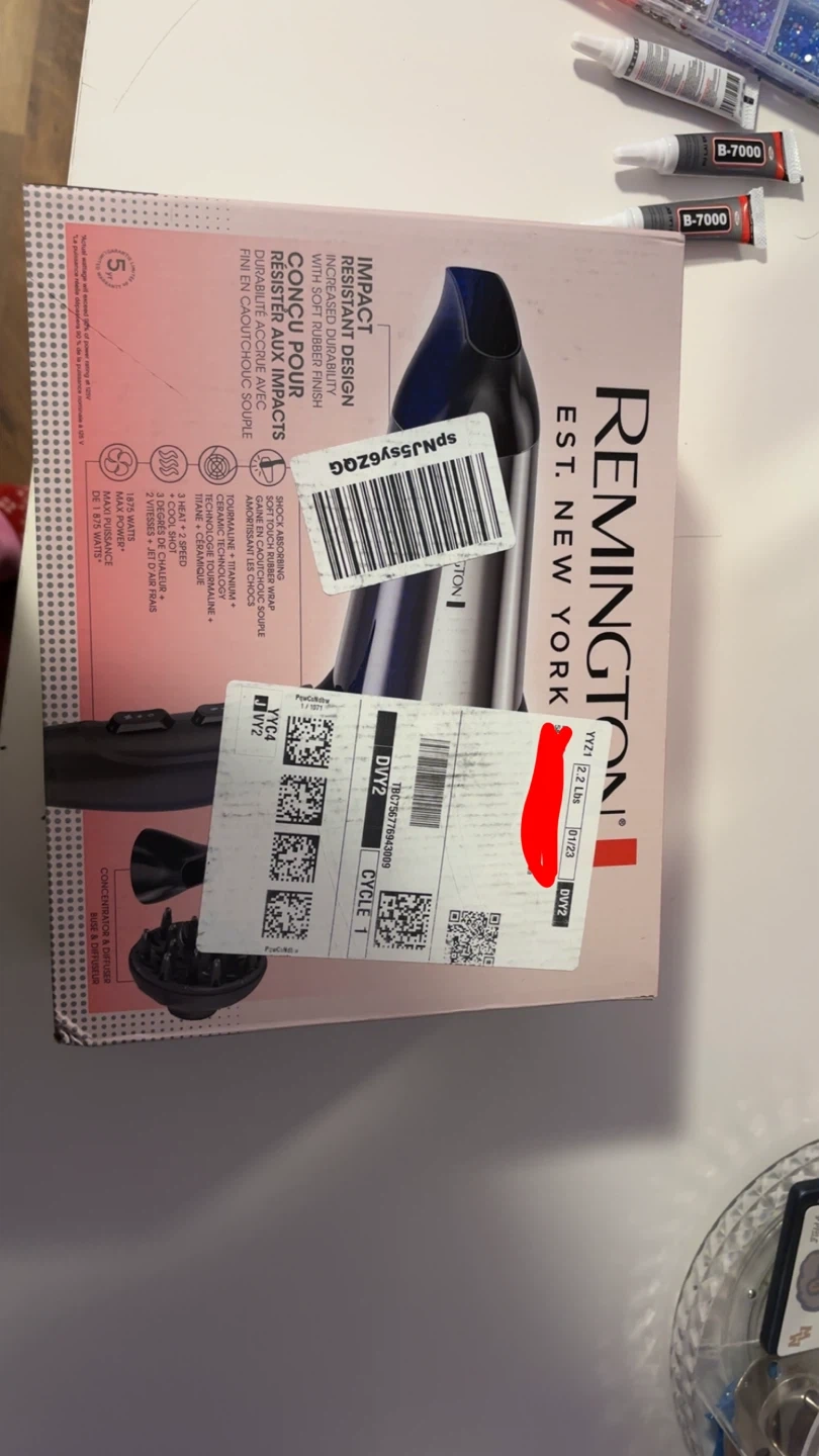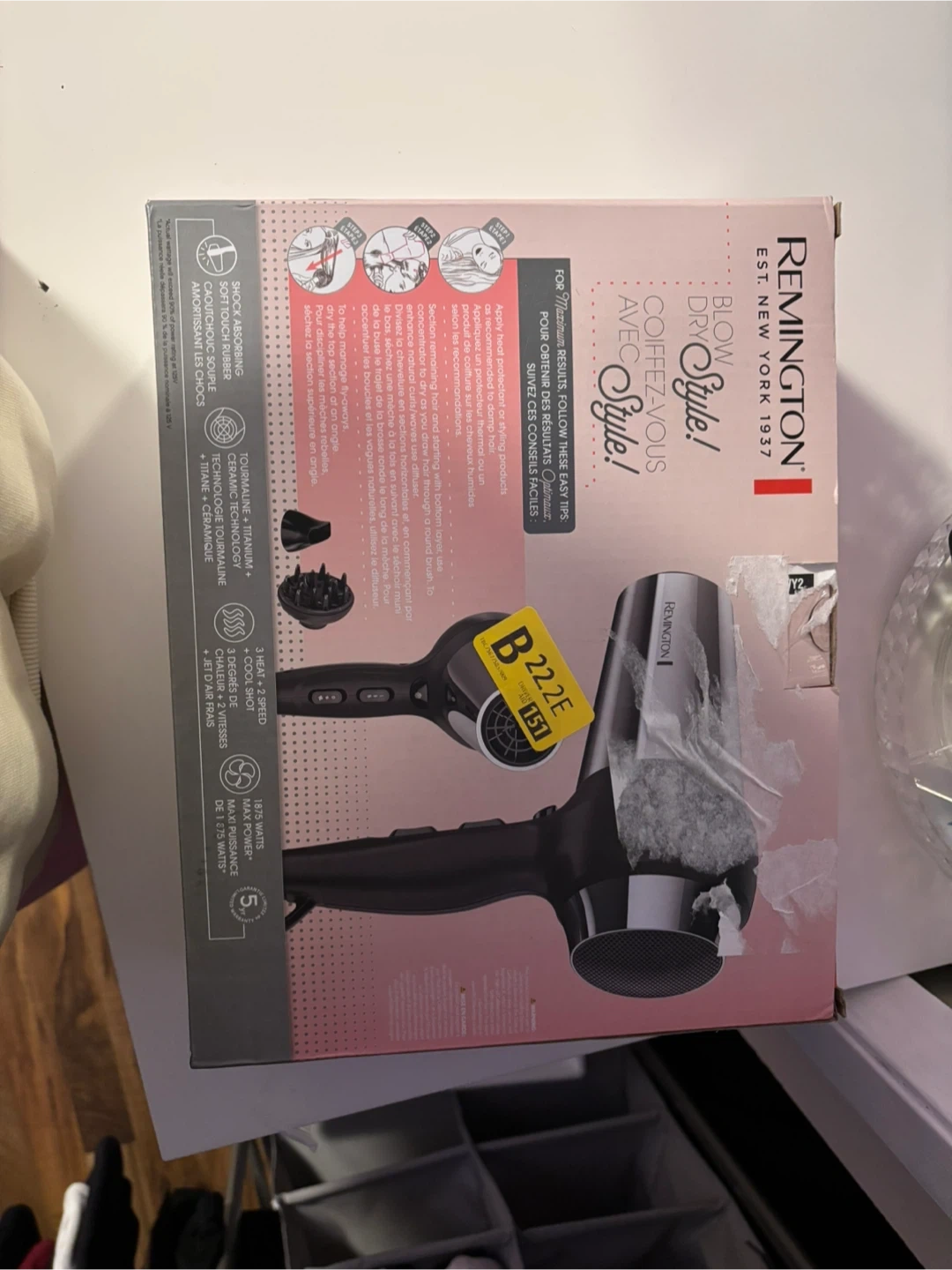 Remington hair dryer with "Est. New York 1937" branding. It comes with a concentrator nozzle and diffuser. Features 3 heat and 2 speed settings, plus a cool shot.