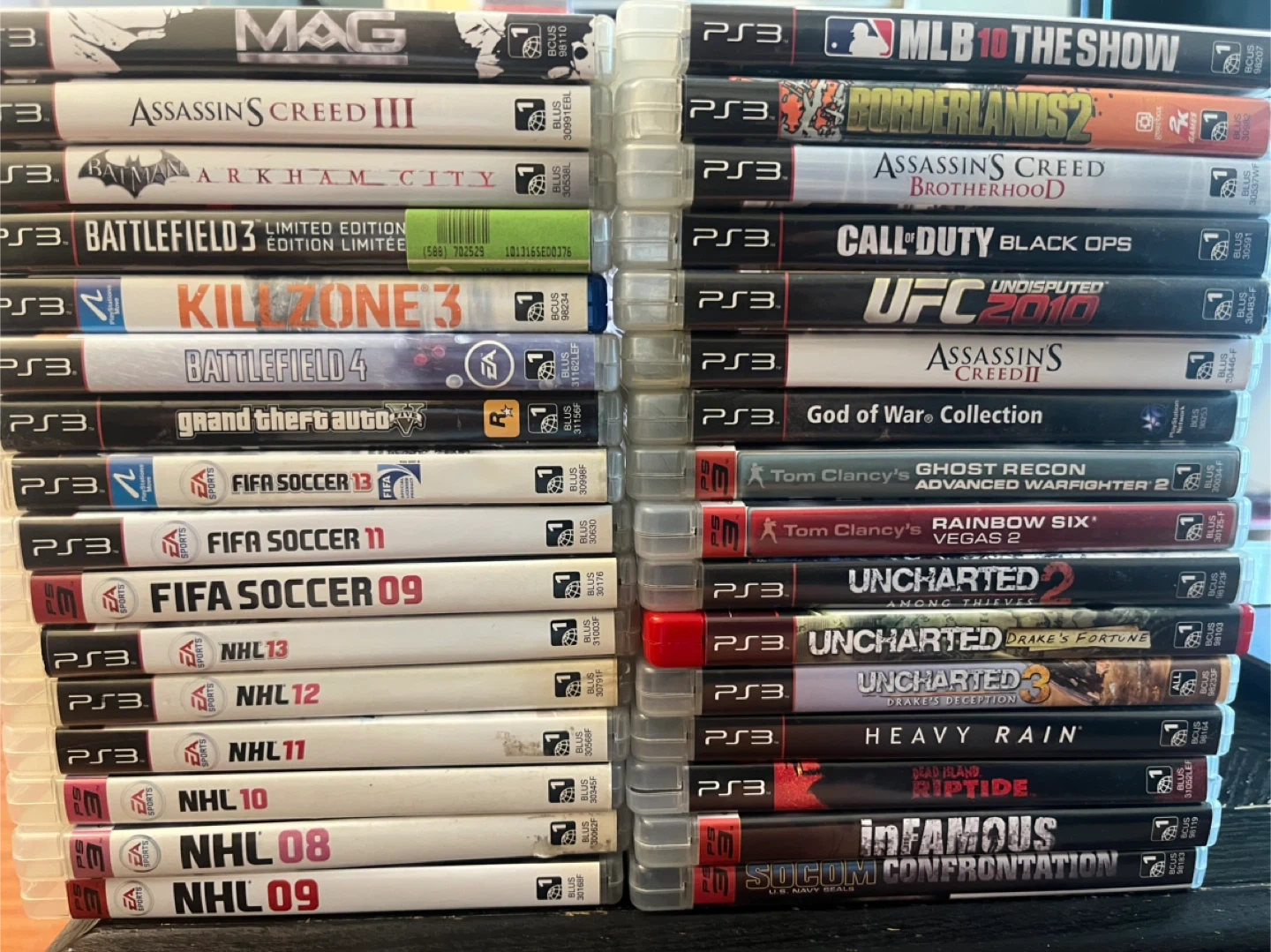 Collection of PlayStation 3 video games including popular franchises like Assassin's Creed, Battlefield, FIFA, NHL, Uncharted, and God of War. These are all for the PS3 console.