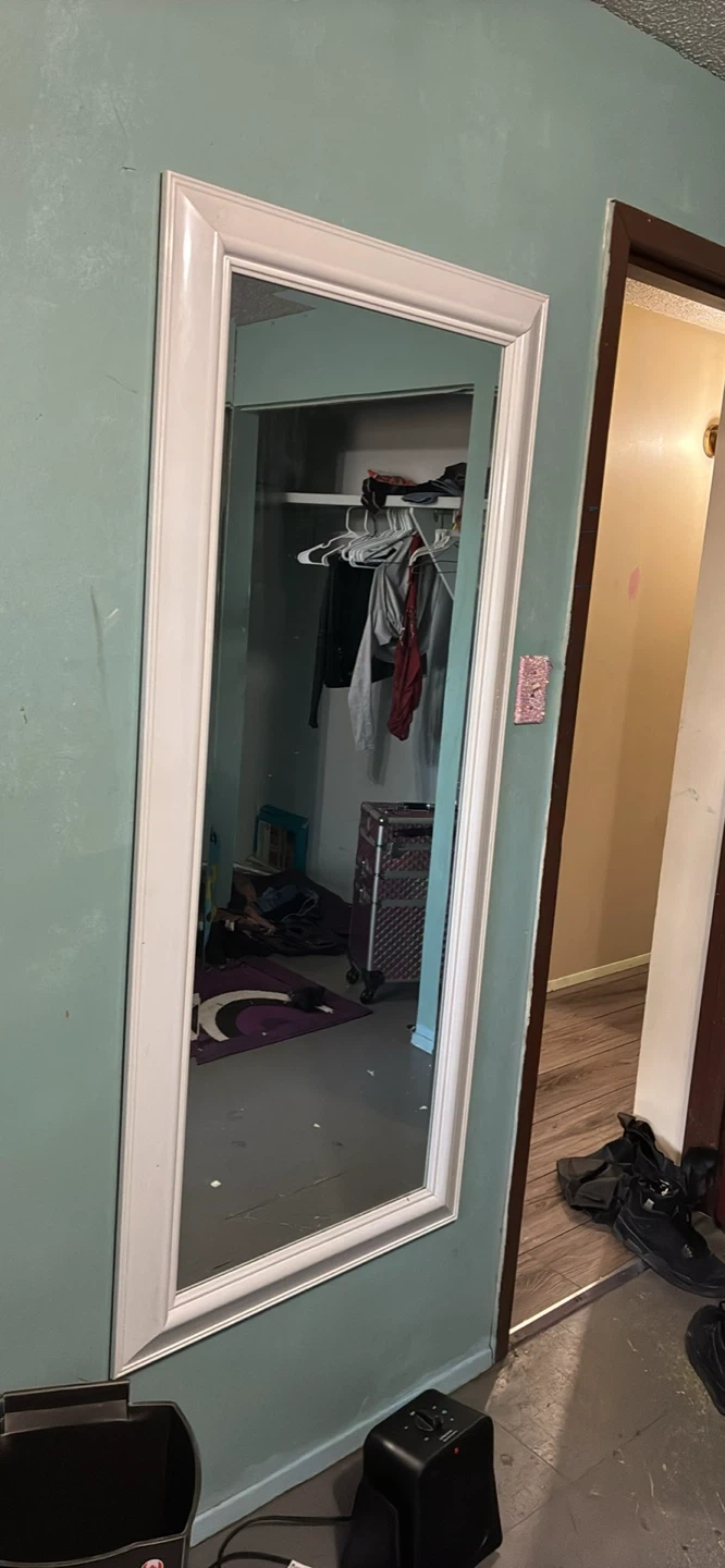A full-length mirror with a simple white frame. It's tall and narrow, perfect for checking your outfit before heading out. Adds a functional and decorative touch to any room. Available for pick up only.