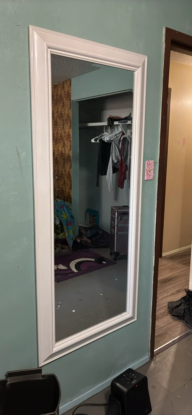A full-length mirror with a simple white frame. It's tall and narrow, perfect for checking your outfit before heading out. Adds a functional and decorative touch to any room. Available for pick up only.