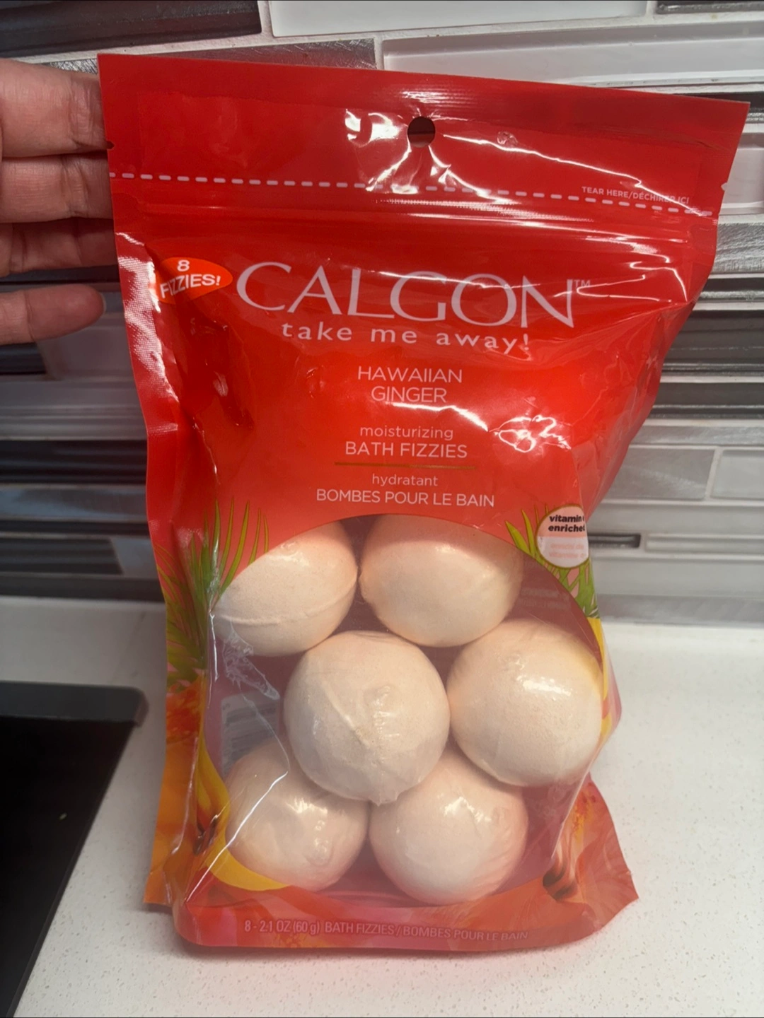 Calgon Hawaiian Ginger moisturizing bath fizzes. Contains 8 fizzy balls. Each bath fizzy is 2.1 oz (60g).