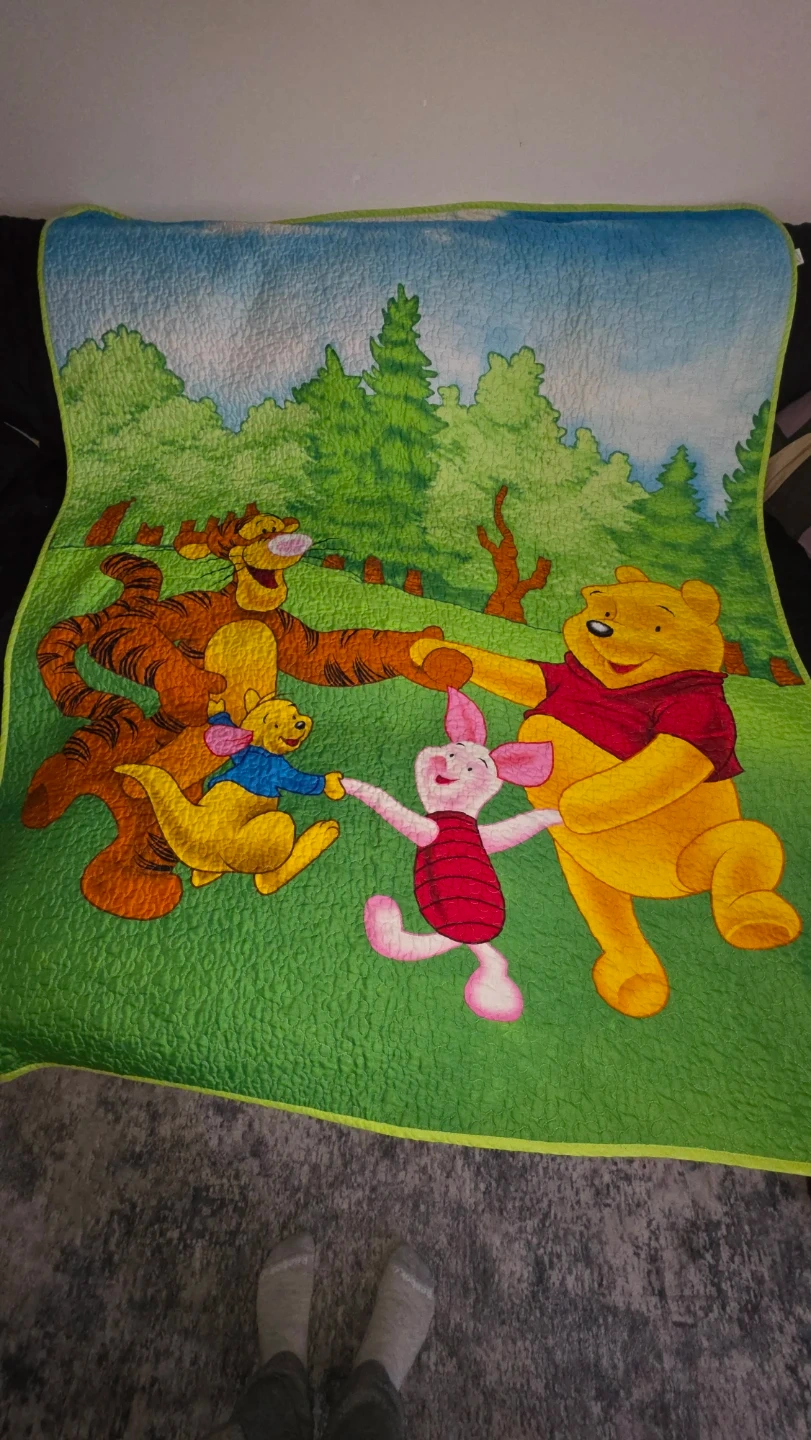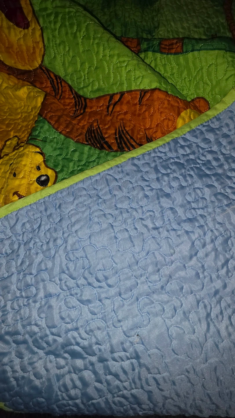 This quilt features Winnie the Pooh, Tigger, and Piglet playing in a forest scene. It's quilted for added softness and durability. The backside has a blue pattern with embossed shapes.