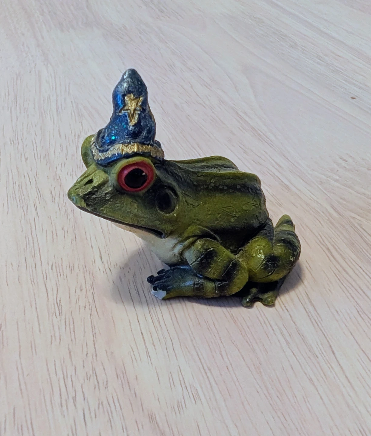 This cute frog figurine wears a sparkly wizard hat. It's made of resin and has a shiny green finish with black stripes. This little guy would add a touch of fun to any desk or shelf!