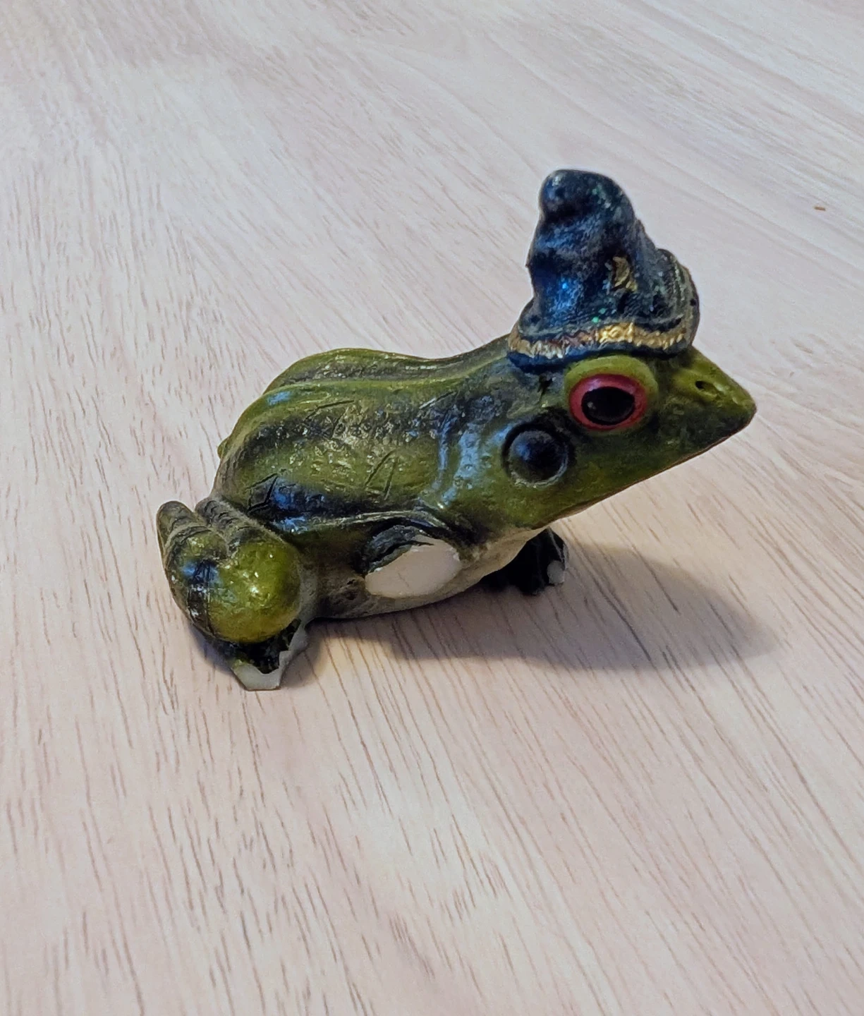 This cute frog figurine wears a sparkly wizard hat. It's made of resin and has a shiny green finish with black stripes. This little guy would add a touch of fun to any desk or shelf!