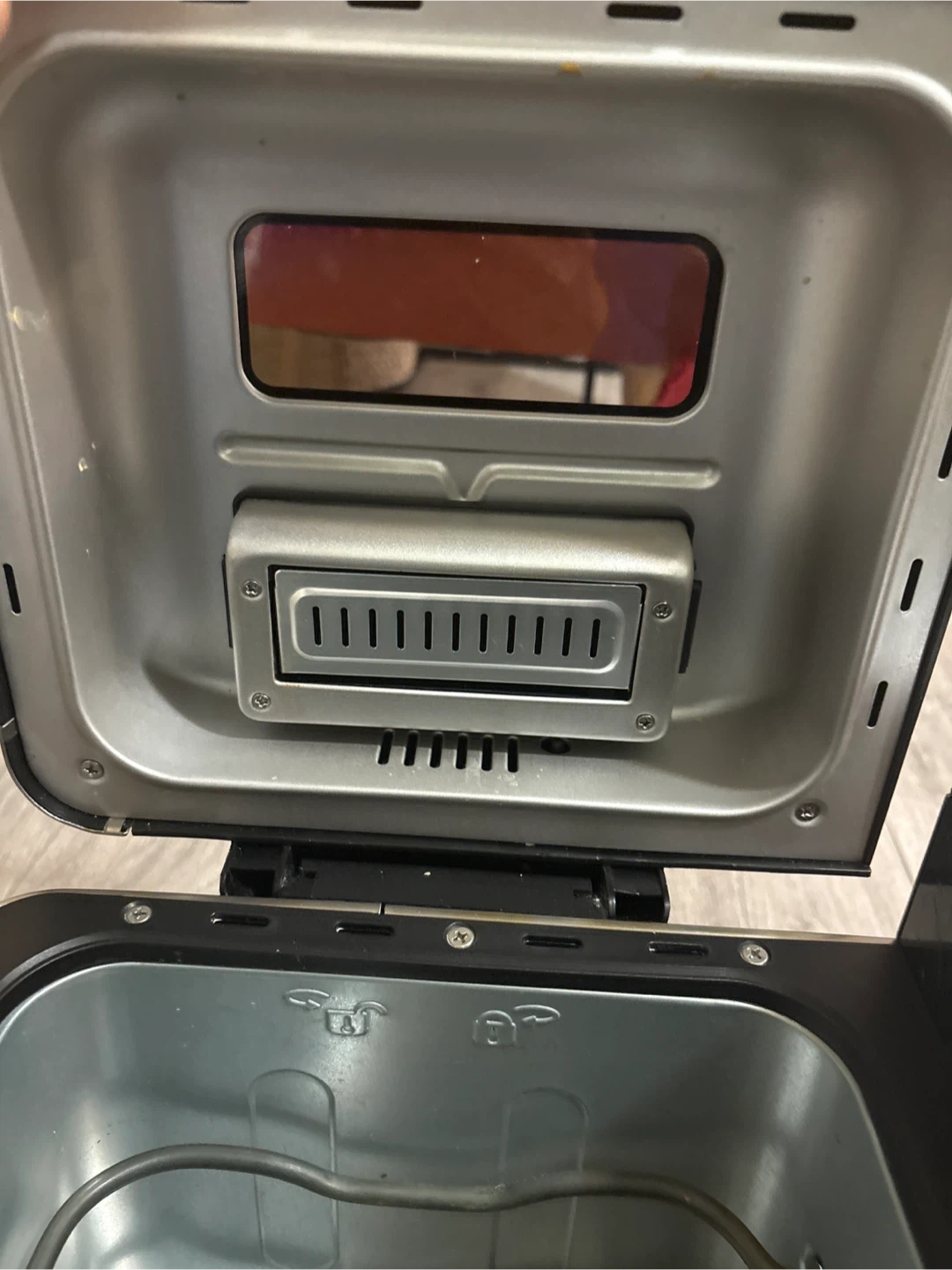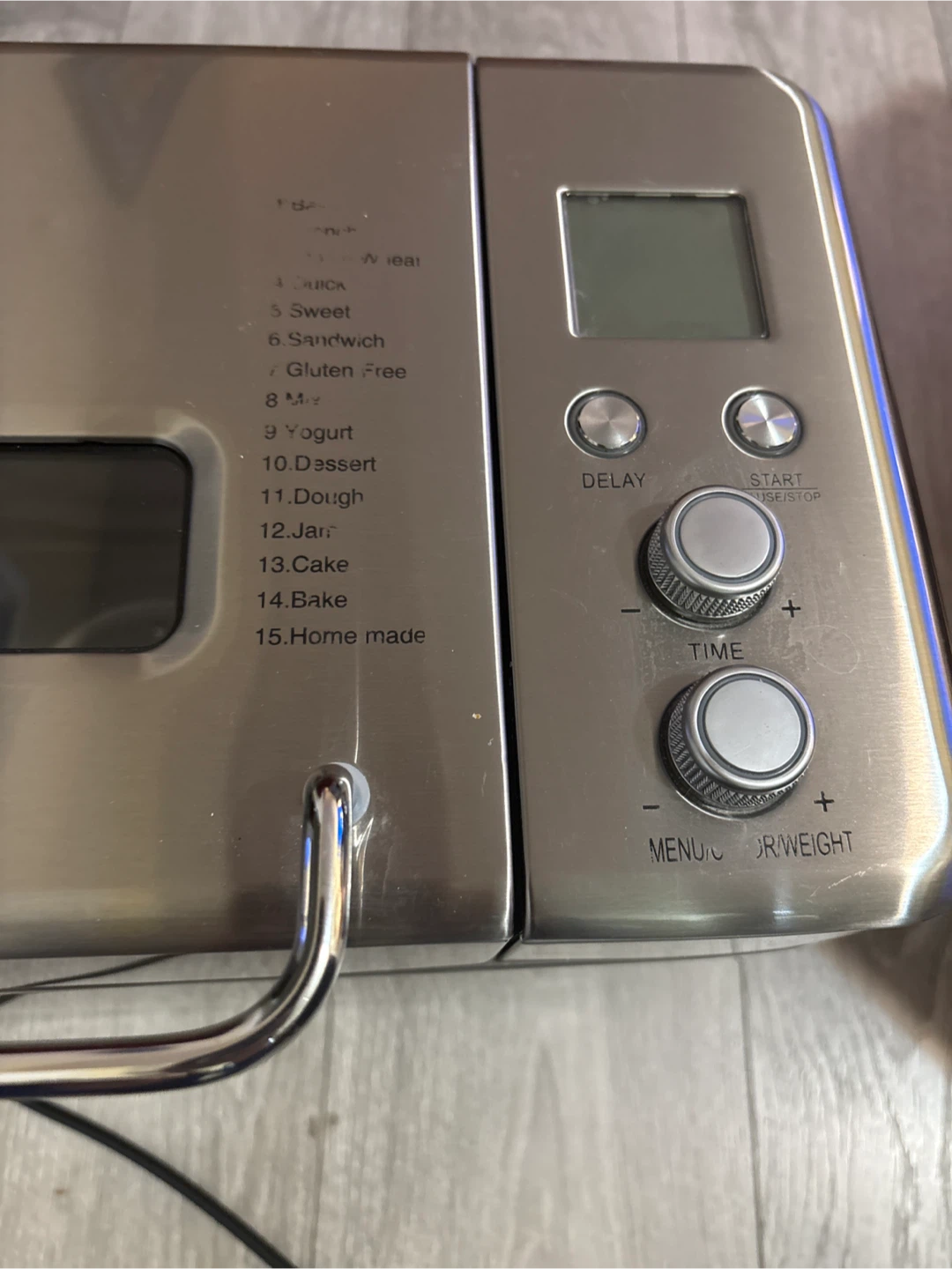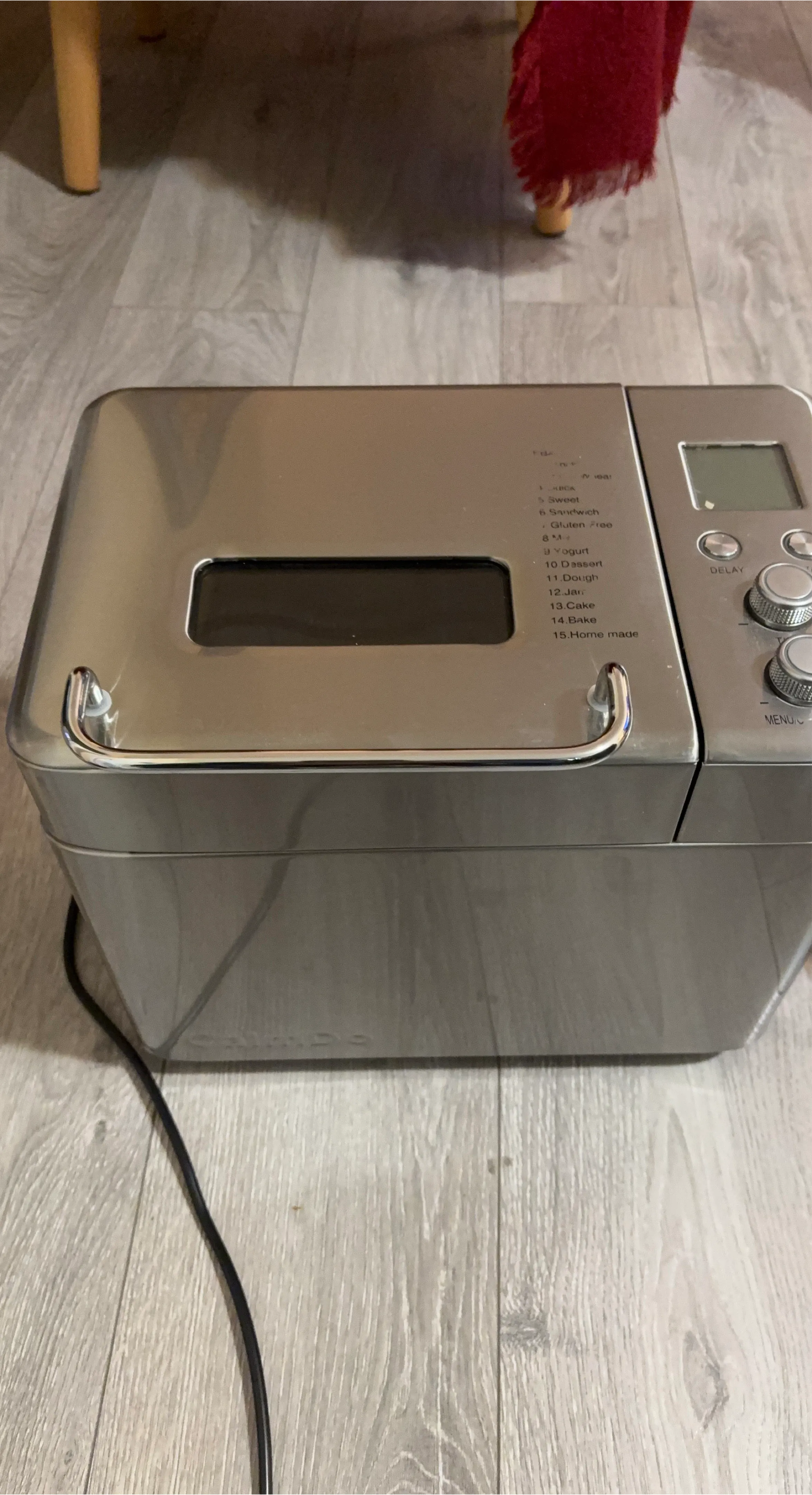 Make fresh bread at home with this CalmDo bread maker. It has multiple settings including sweet, sandwich, gluten-free, yogurt, dessert, dough, jam, cake, and bake options. Stainless steel exterior and interior.